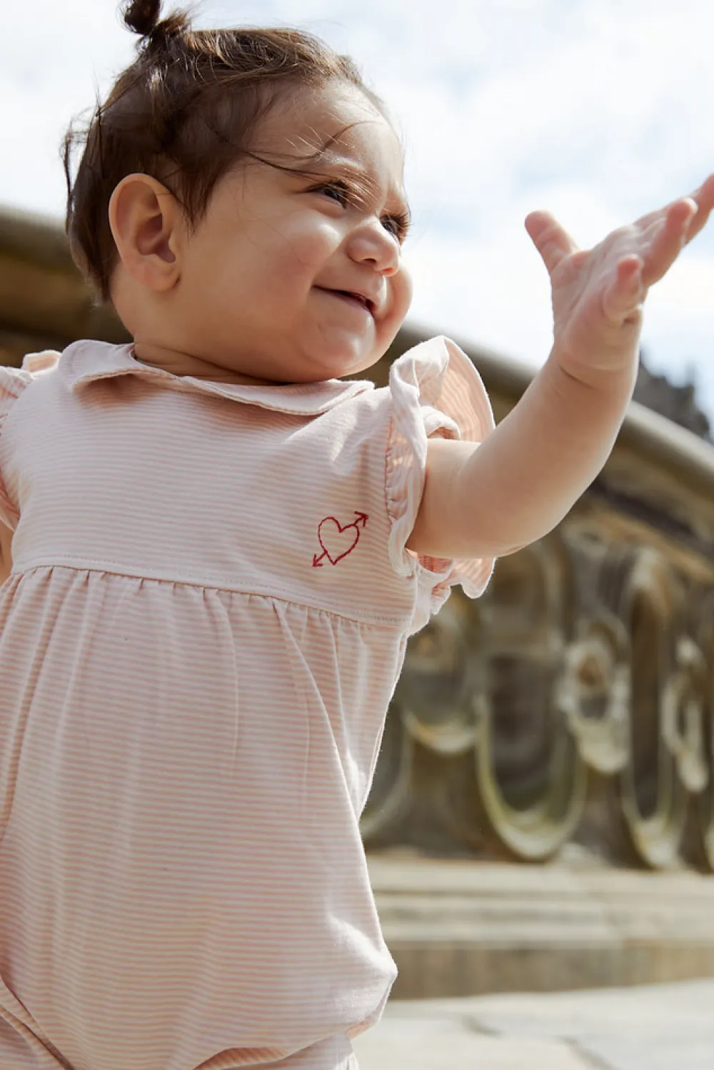 Tilføj et legende præg til din babys garderobe med denne stribet romper med broderi. Den er lavet af blødt, åndbart stof, hvilket sikrer komfort hele dagen. De søde striber kombineret med den delikate brodering giver et sødt udtryk. Den praktiske knaplukning og trykknapper i bunden gør bleskift nemt og hurtigt. Perfekt til både legeaftaler og festlige anledninger, denne romper er et must-have til de varme dage.