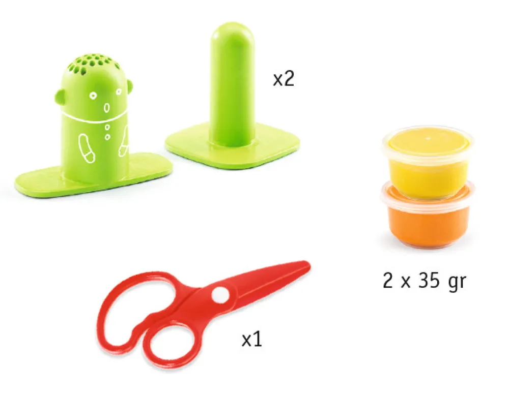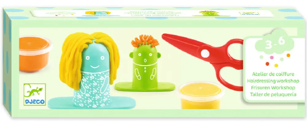 2 sjove hoveder og 2 bøtter modellervoks. Så er du klar til at lave sjovt hår på figurene og klippe dem i sjove frisurer.