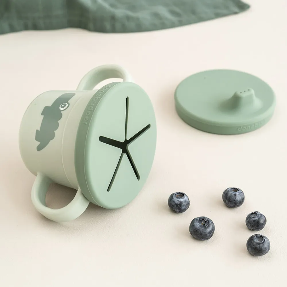 Foodie tud- og snackkoppen er perfekt til de små. Snacklåget sørger for at snacks ikke ender overalt i bilen eller barnevognen. Tudkoplåget er spildsikkert, og når dit barn er klar, kan koppen bruges uden låg. De to hanke sikrer et godt greb. 3-i-1-koppen er designet til hverdagslivet med børn og tåler både opvaskemaskine og mikroovn. Efter utallige familiemiddage og børnefester kan tallerkenen affaldssorteres som plast og genanvendes til produktion af nye hverdagsprodukter.