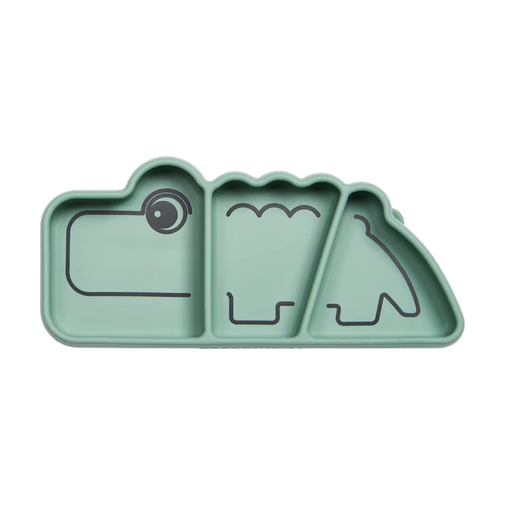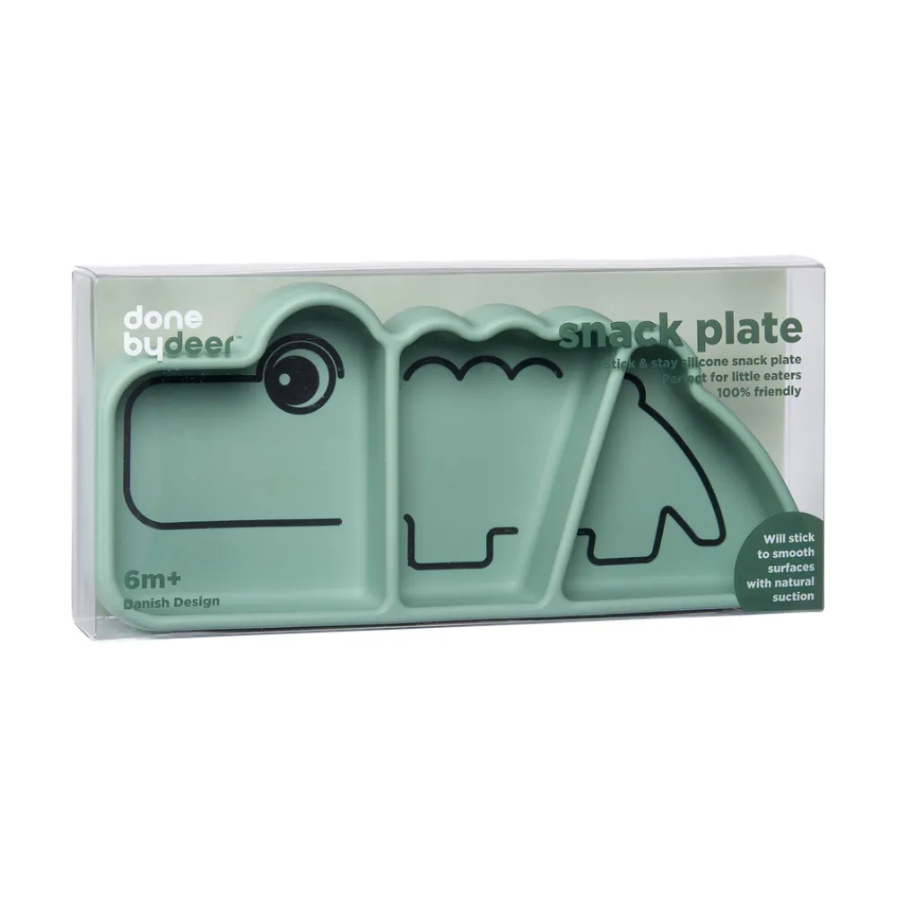 Gør mellemmåltiderne sjove med Croco snack tallerken. Den smarte stick & stay funktion sikrer, at tallerkenen står fast. De tre opdelte rum er perfekt til at adskille maden. Pres let på tallerkenen, så den suger sig fast til en glat overflade ved hjælp af naturligt vakuum, og forhindrer de små i at løfte eller tippe den. Hiv op i flappen under Croco’s hale for at ophæve suge funktionen.
