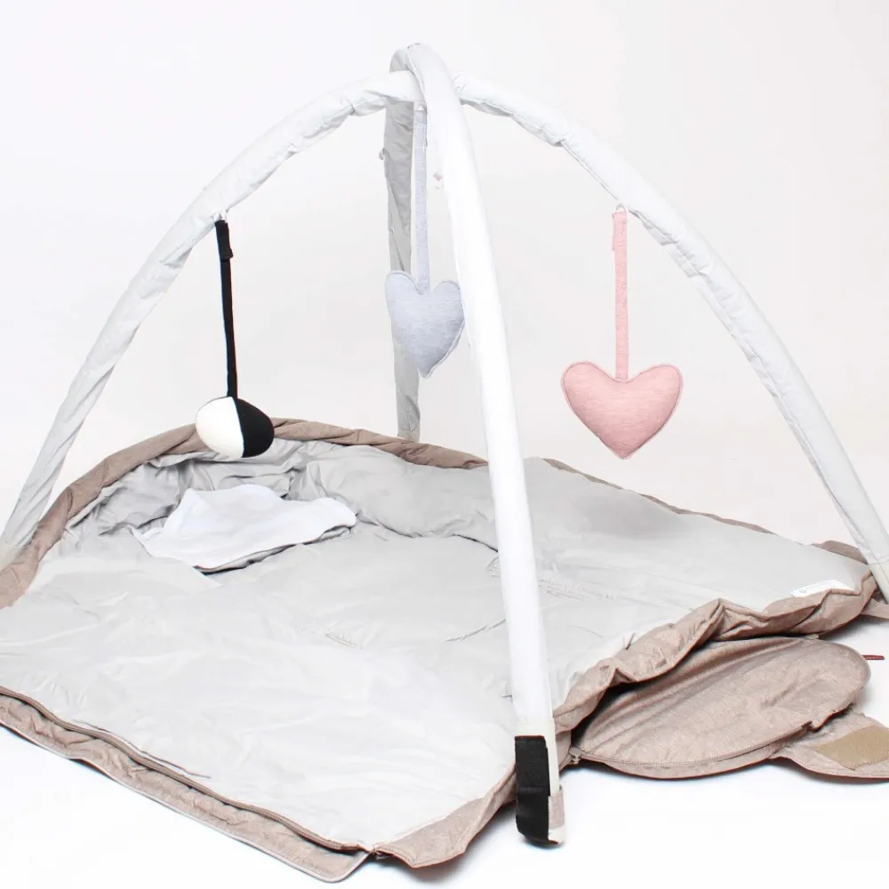 Legebøjle til at fastgøre på Easygrow kørepose, når den bruges som et legetæppe. Tilpasset modellerne HOOD, Exclusive, NORD og Nature. Til leg og stimulering af sanser og motorikken hos barnet. Leveres med 3 stk. legetøj i blødt stof, der nemt kan fjernes: spejl, bold med klokke og hjerte.