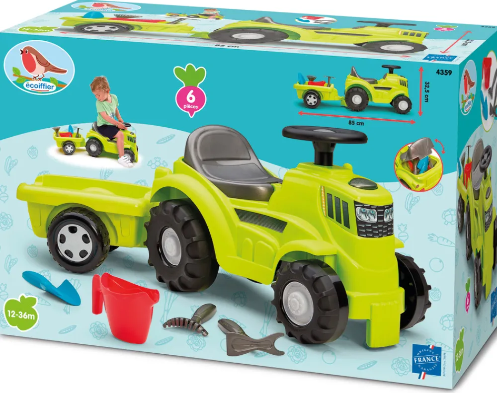 Traktor gåbil med trailer og tilbehør, der egner sig perfekt til forskellige gøremål i haven.