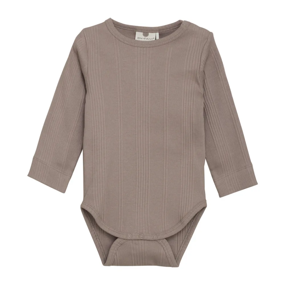 Klassisk body fra EN FANT i rib og ensfarvet design. Bodyen er fremstillet i en blød bomuldskvalitet, der føles behagelig mod huden og giver god komfort hele dagen. Den har lange ærmer, en rund halsudskæring og lukkes praktisk med trykknapper mellem benene – ideel til både hverdag og leg.