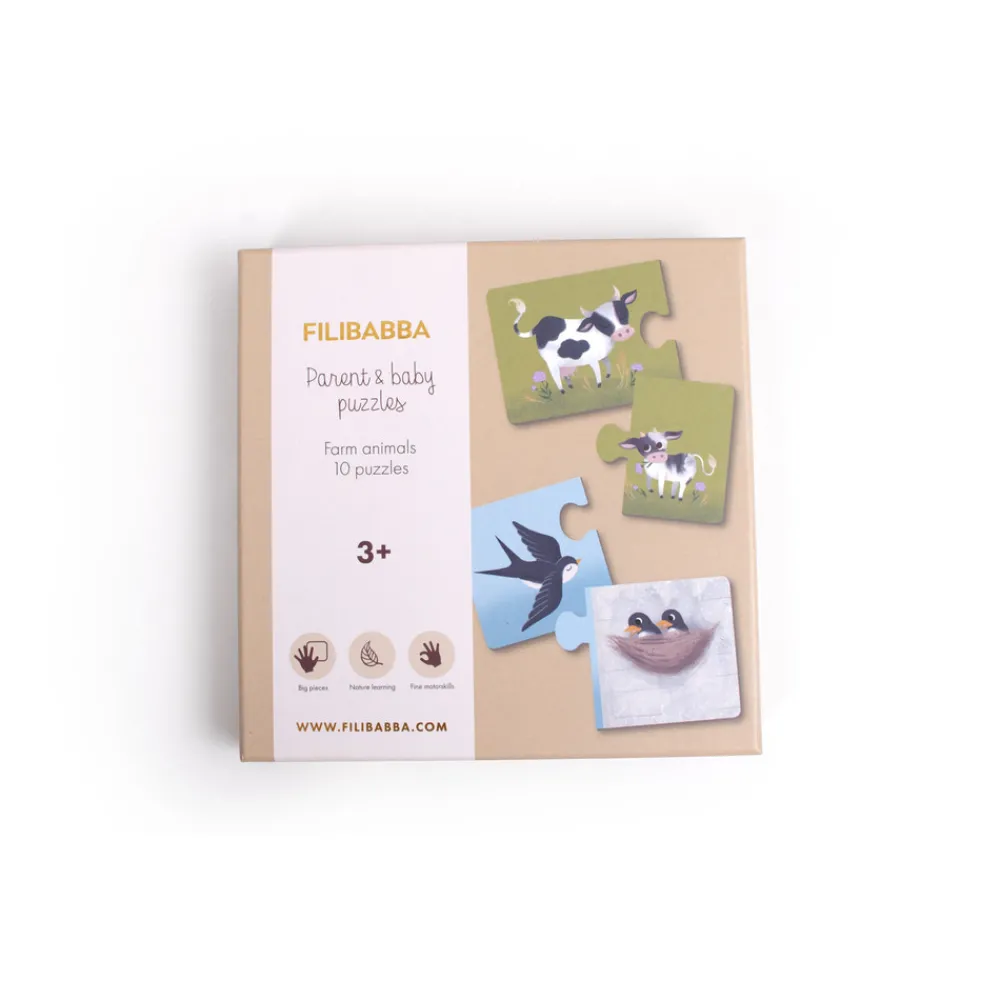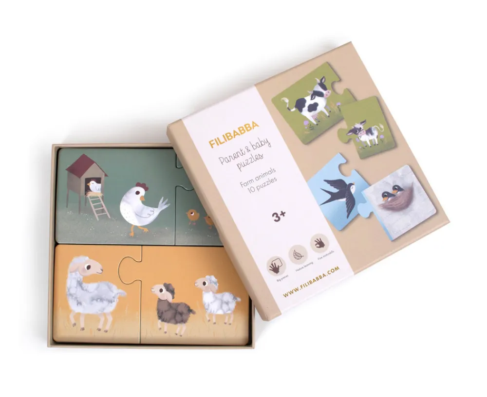 Dit nye puslespilssæt består af ti fine puslespil med hver to store brikker med farverige håndtegnede illustrationer af dyreforældre og deres søde unger.