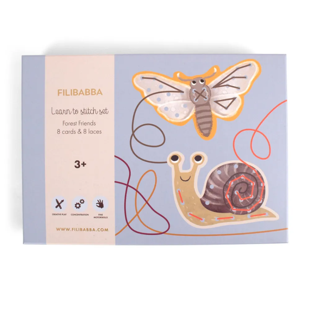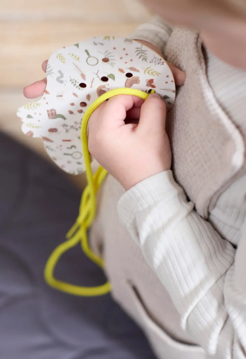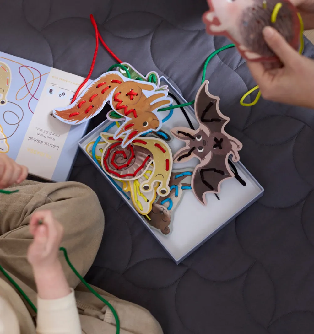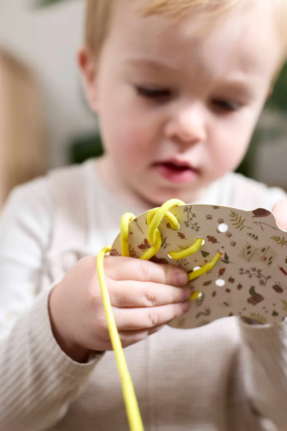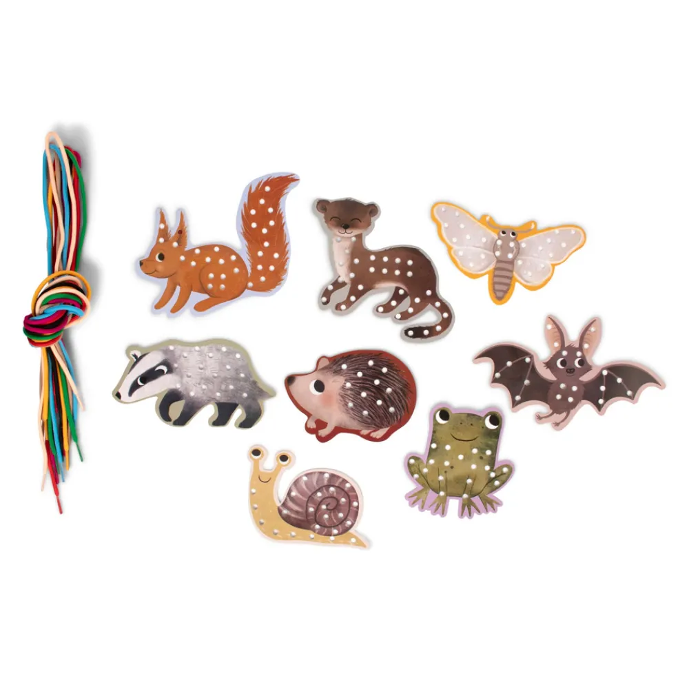 Her trækkes farverige snore gennem forstansede huller i de otte vidunderlige håndillustrerede dyreskabeloner ved hjælp af fingrene. Dette giver dig mulighed for at skabe smukke mønstre, samtidig med at du leger og træner din fingerfærdighed.