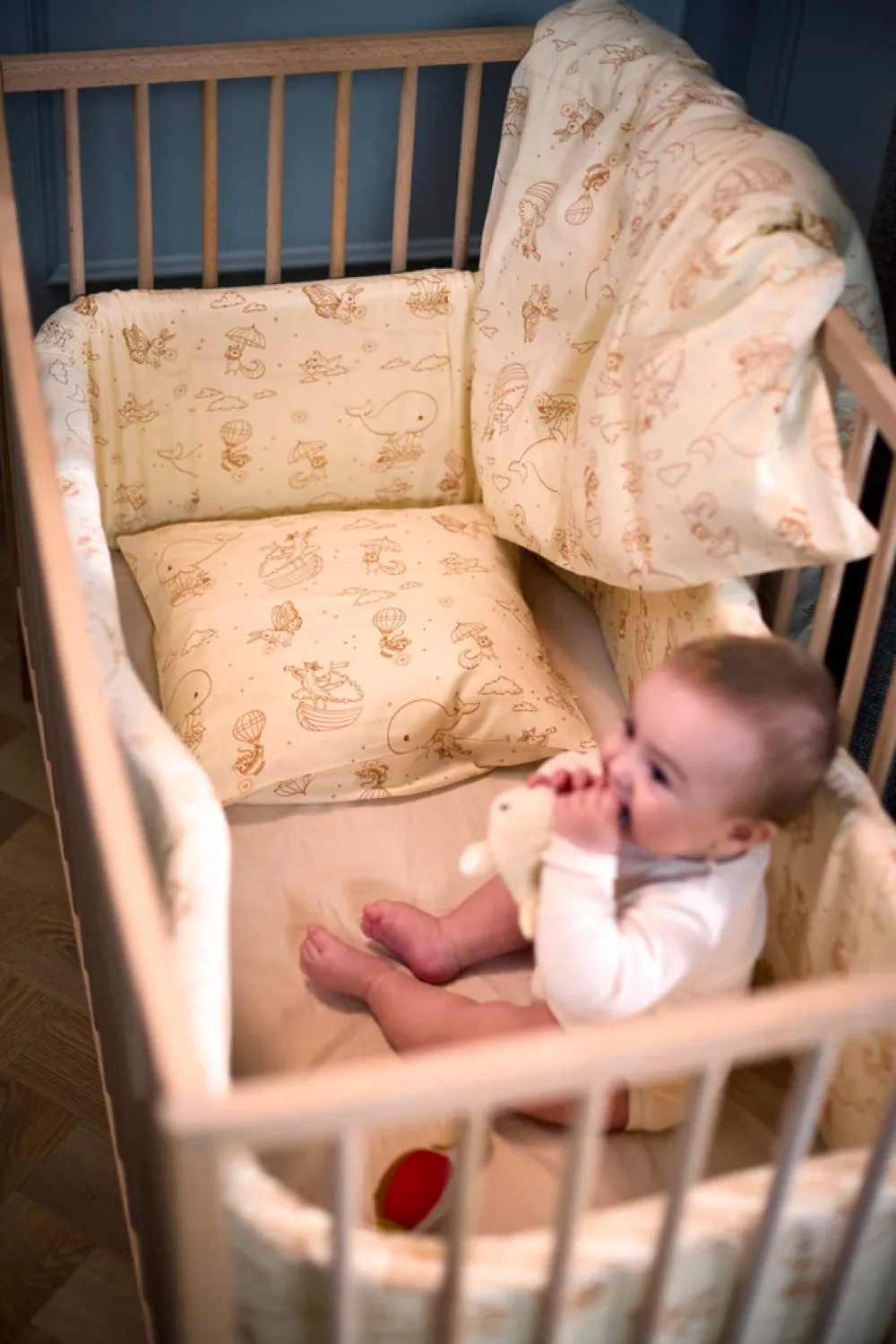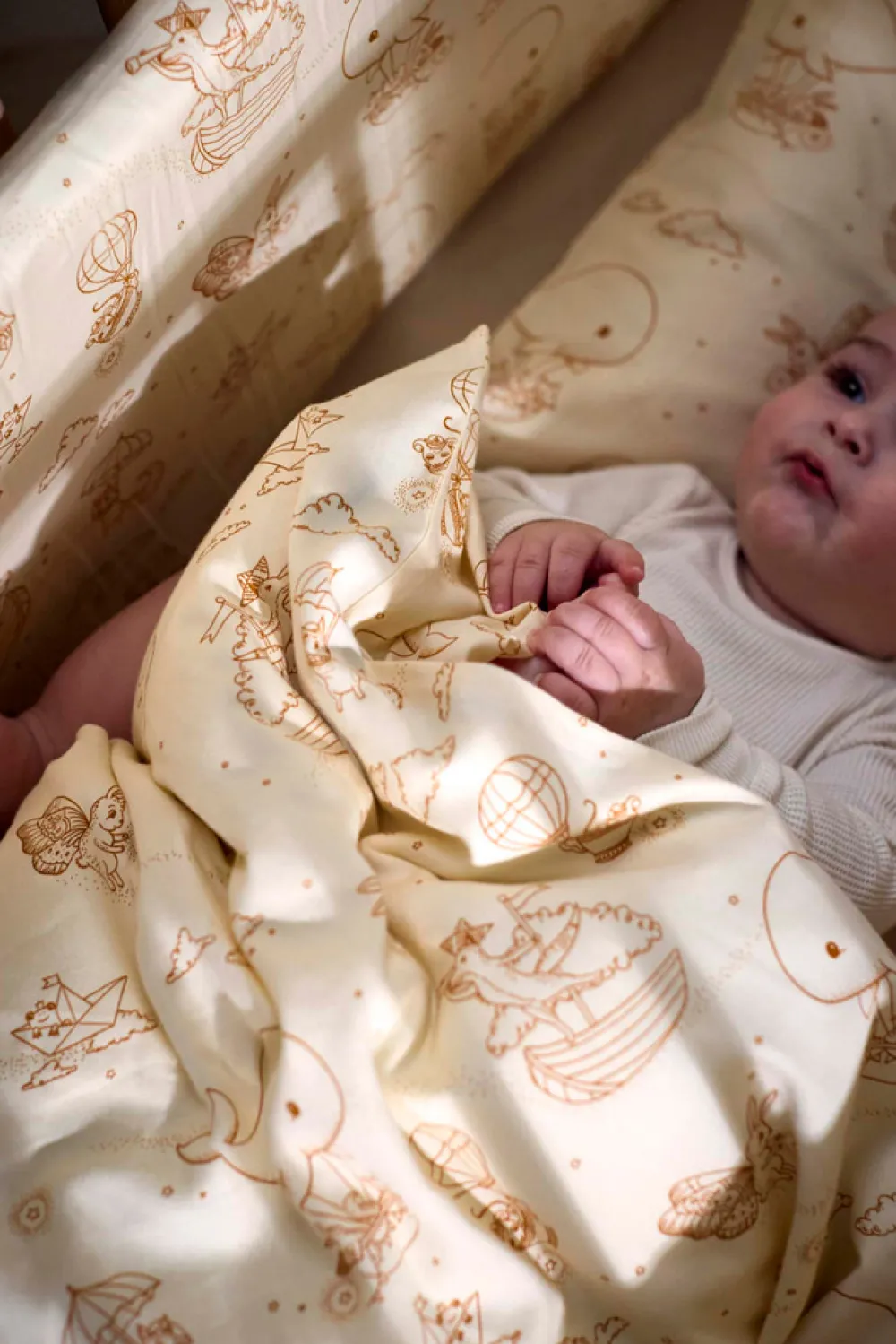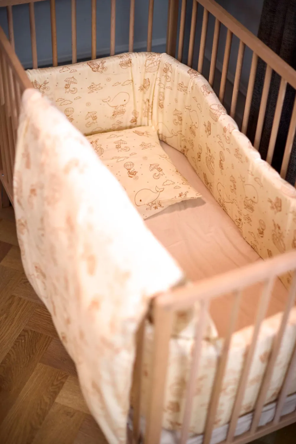 Forældre bruger meget tid på at hjælpe vores kære små med at falde i søvn, og findes der egentlig en bedre måde at slutte dagen på end at blive puttet ned i små glimt af glæde med et kys? Sengerand er designet til at skabe en hyggelig stemning i enhver krybbe og tremmeseng. Hvis din seng er mindre, skal du blot lægge sengerandens ender over hinanden. Den 4 cm tykke polyesterskumkerne hjælper sengeranden med at stå oprejst, så du ikke skal fastgøre den til sengen med f.eks. bånd. Derudover sikrer den ekstra tykke kvalitet, at din baby ikke slår hovedet ind i sengens hårde tremmer. Den integrerede lynlåsfunktion hjælper dig med at tage betrækket af, så du kan vaske det efter behov. Husk at trække betrækket i form og putte det direkte på skumkernen efter i vask. Lad betrækket tørre på sengeranden for at mindske risikoen for, at det krymper.