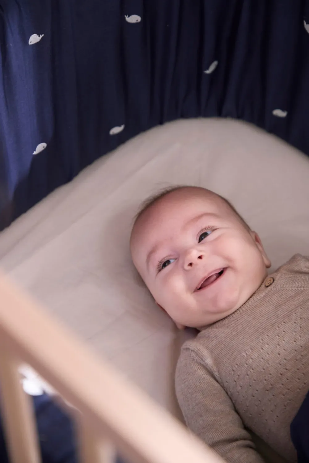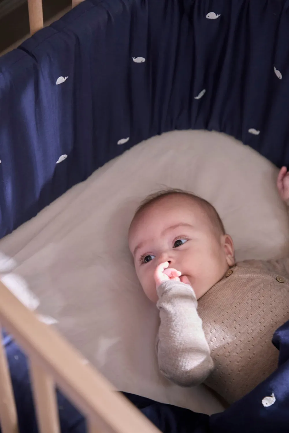 Forældre bruger meget tid på at hjælpe vores kære små med at falde i søvn, og findes der egentlig en bedre måde at slutte dagen på end at blive puttet ned i små glimt af glæde med et kys? Sengerand er designet til at skabe en hyggelig stemning i enhver krybbe og tremmeseng. Hvis din seng er mindre, skal du blot lægge sengerandens ender over hinanden. Den 4 cm tykke polyesterskumkerne hjælper sengeranden med at stå oprejst, så du ikke skal fastgøre den til sengen med f.eks. bånd. Derudover sikrer den ekstra tykke kvalitet, at din baby ikke slår hovedet ind i sengens hårde tremmer. Den integrerede lynlåsfunktion hjælper dig med at tage betrækket af, så du kan vaske det efter behov. Husk at trække betrækket i form og putte det direkte på skumkernen efter i vask. Lad betrækket tørre på sengeranden for at mindske risikoen for, at det krymper.