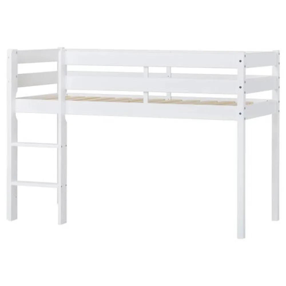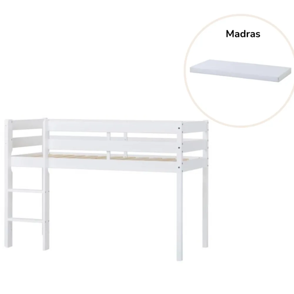 ECO Comfort Halvhøj seng i størrelse 70×160 cm. fra Hoppekids er en lille og praktisk seng. Den passer ind på selv de mindste børneværelser og giver ekstra gulvplads. Man kan bl.a. bruge pladsen til ekstra opbevaring eller som legeområde. Højden på sengen er 72 cm og er god til børn, som gerne vil have en høj seng uden, at den bliver for høj. Under sengen er der rig mulighed for opbevaring eller ekstra gulvplads. Hvis I hænger forhæng foran sengen kan der skabes den hyggeligste hule – pynt den eventuelt med lyskæder, fine billeder, en madras, puder og tæpper. Sengen er svanemærket. Svanemærket er jeres garanti for, at produktet overholder alle EU-standarder inden for børnemøbler og er testet på disse. Samtidig tages der størst mulige hensyn til miljøet både ved indkøb af råvarer, under selve produktionen, i produktets liv og når produktet skal bortskaffes. Overfladen er behandlet med miljøvenlig, vandbaseret lak, fri for unødige kemikalier og skadelige stoffer. Den lille størrelse 70×160 cm gør sengen perfekt til det lille værelse eller til børn, som ikke helt er klar til en voksenseng endnu. Der er stadig rigeligt med plads til at vokse, uden at sengen føles stor og utryg.