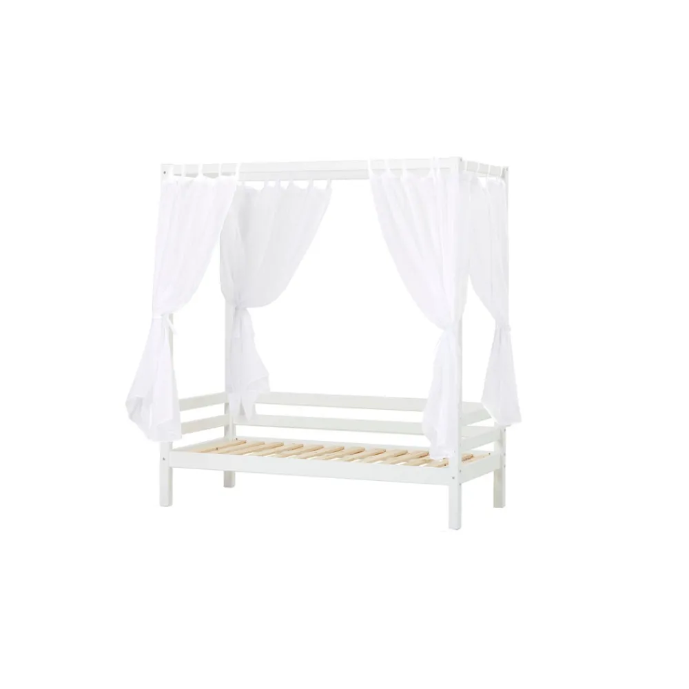 Med dette Himmeltekstil kan du nemt skabe en hyggelig og tryg atmosfære på børneværelset og i sengen. Gardinet skaber en huleagtig stemning i sengen, uden at lukke helt af for resten af værelset. Lad gardinet hænge frit eller fæstn dem til sengestolperne for den ultimative prinsessedrøm. Gardinet er nemt at montere og sidder godt fast, så barnet selv kan trække gardinet for eller fra. Pynt eventuelt sengen med lyskæder og hyggelige puder. Hæng lidt billeder op ”inde” i sengerammen og skab en hyggelig rum-i-rummet-effekt.