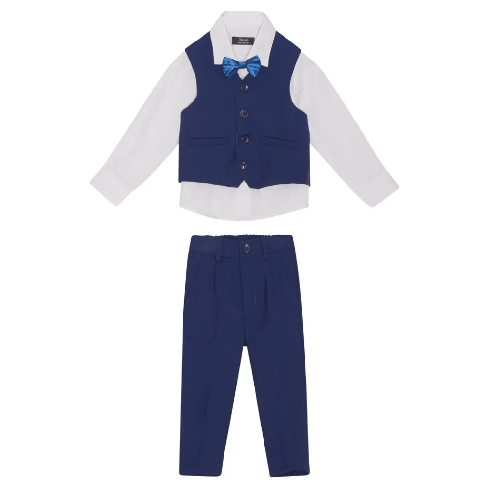 Et super flot 4 delt sæt til den smarte lille dreng eller pige, fra Jocko. Sættet består af en hvid skjorte, en sort vest, sorte bukser og en fin butterfly. Skjorte og vest lukkes med knapper, og bukserne med en enkelt knap og lynlås. Butterfly med justering i nakken. Perfekt til den fine fest.