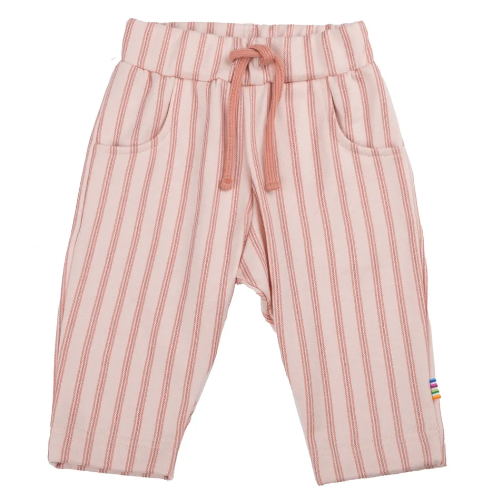 Bred elastik samt bindebånd i taljen. 2 små lommer foran som sød detalje. En blød og stabil økologisk bomuldskvalitet med tæt strikning, meget behagelig at have på. Sød stribet print.