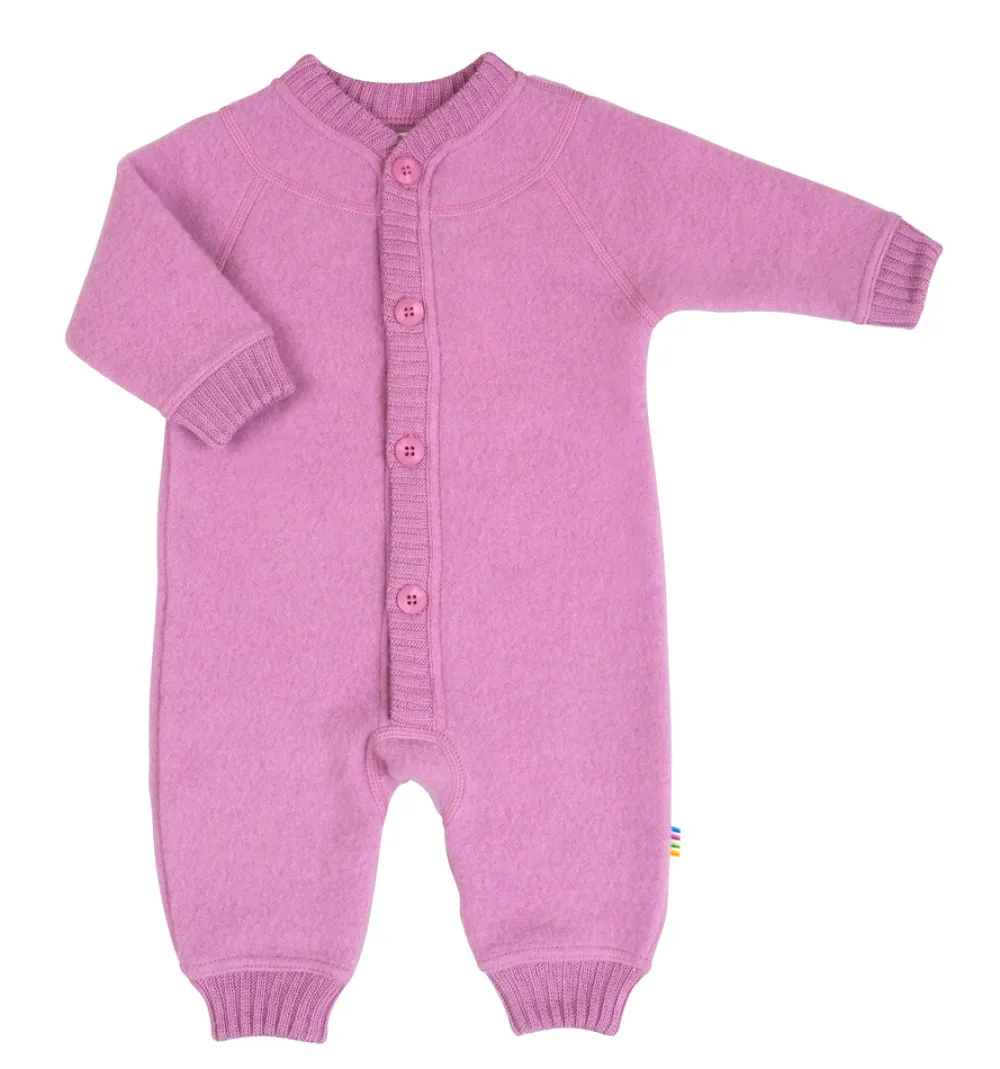 Heldragt. Lukkes foran med knapper. Ribkant i hals, knaplukningen, ærmer og ben. En kraftig børstet uldkvalitet som er ekstra blød. Brug dragten i autostolen eller barnevognen.