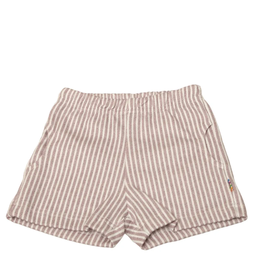 Shorts. God elastik i taljen. Med fine, små sidelommer som sød detalje. En blød og stabil økologisk bomuldskvalitet med tæt strikning, meget behagelig at have på. Sød stribet print. Oeko-tex 100 mærket.