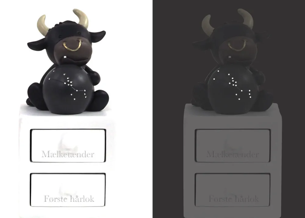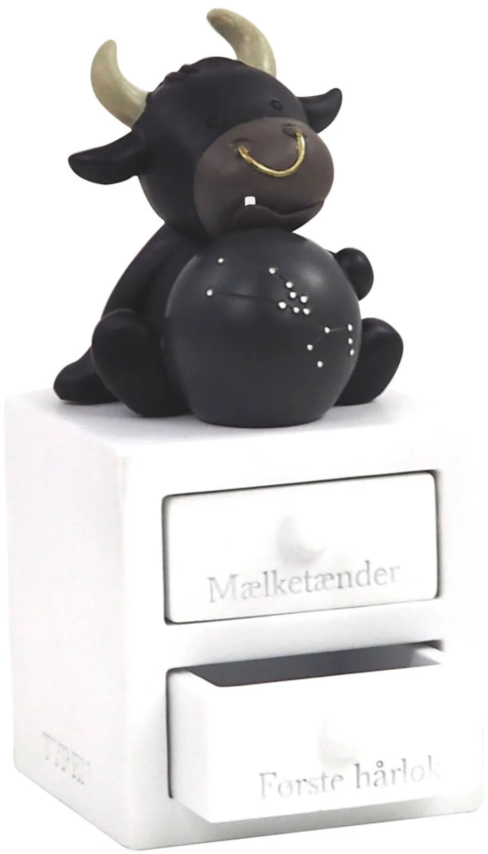 Første tand og hårlok æske med tyren stjernetegn, med planet og stjernebillede, som lyser i mørket. Figuren har to skuffer – En til første tand og en til hårlok. Super fin dåbsgave ide. Æsken er håndmalet så der kan være variationer.