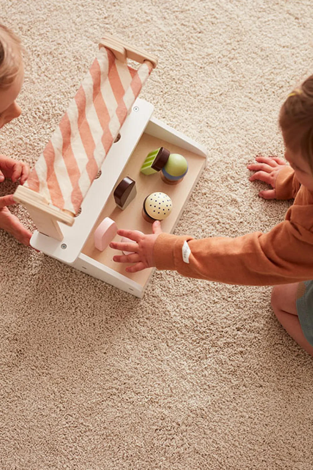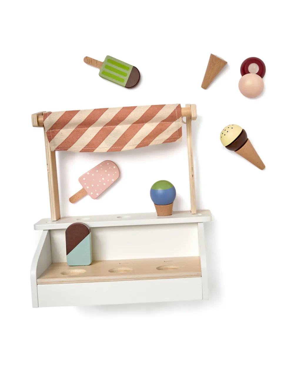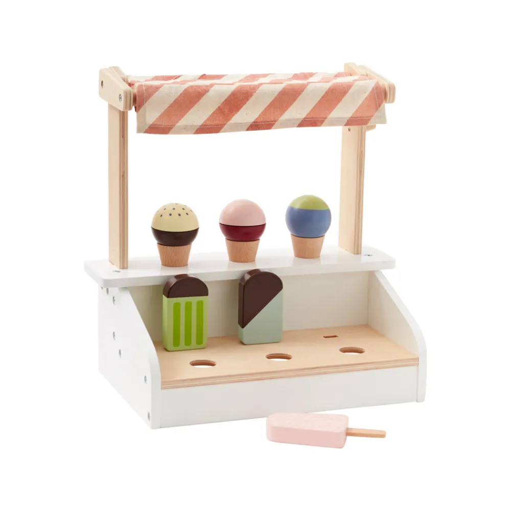 Skab en fortryllende sommeroplevelse med denne charmerende isbod! Den fine trækonstruktion giver dine små guldklumper mulighed for at skabe deres egne fantastiske iskreationer. Lad børnene betjene kunder, lave fantasifulde is og udleve deres kreative sider. Denne træisbod er det perfekte tilbehør til leg og fantasi under solen og indeholder 6 is, hvoraf 2 kan skilles ad og sættes sammen igen. Den lille bomuldsmarkise beskytter isene mod solens stråler.