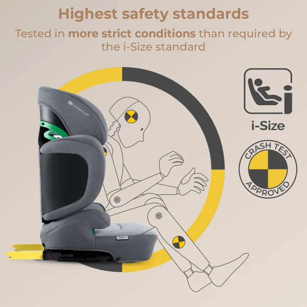 XPAND 2 i-Size autostol er testet under hårdere forhold end krævet (ved side- og frontalkollision). Takket være certificering i henhold til de nyeste standarder kan du fokusere på kørsel, fordi du ved, at dit barn er sikkert.