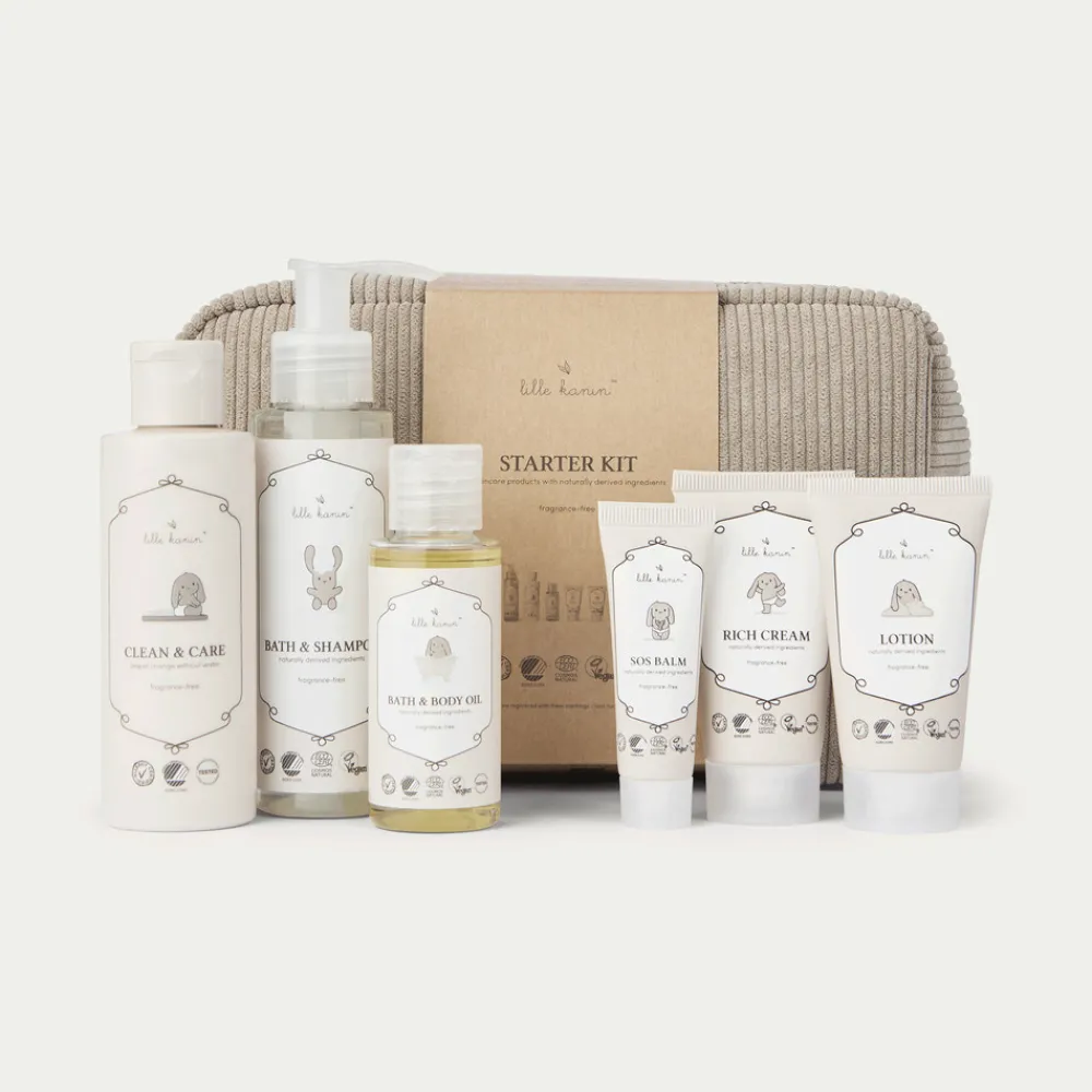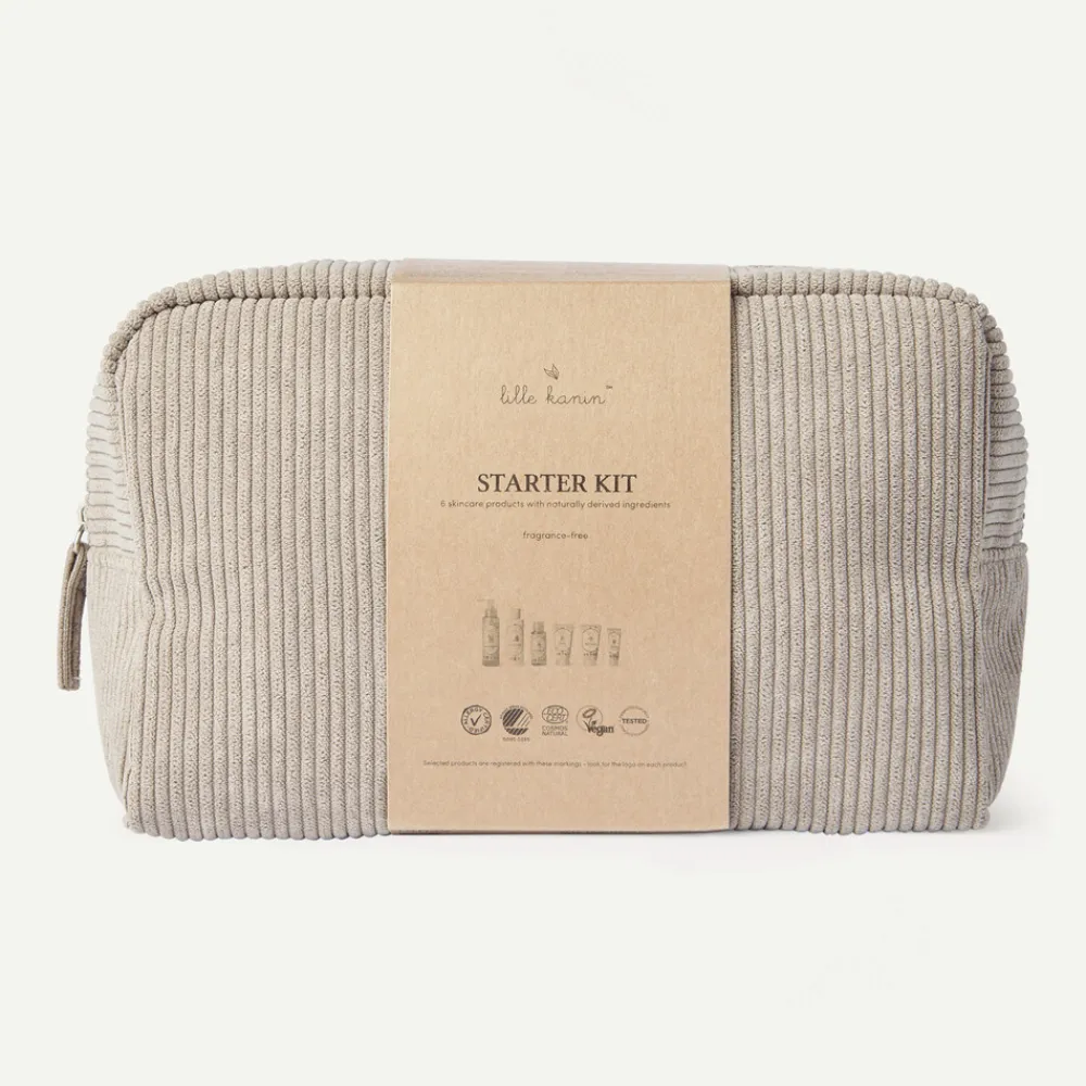 Lille Kanin Starterkit indeholder seks fantastiske produkter samlet i en elegant og praktisk toilettaske. Den rummelige taske har plads til alle produkterne og ekstra rum til bleer, vatrondeller eller andre nødvendigheder, når du er på farten. Dette startkit er den perfekte gave til nybagte forældre eller til dem, der har brug for at fylde op med basisprodukter.