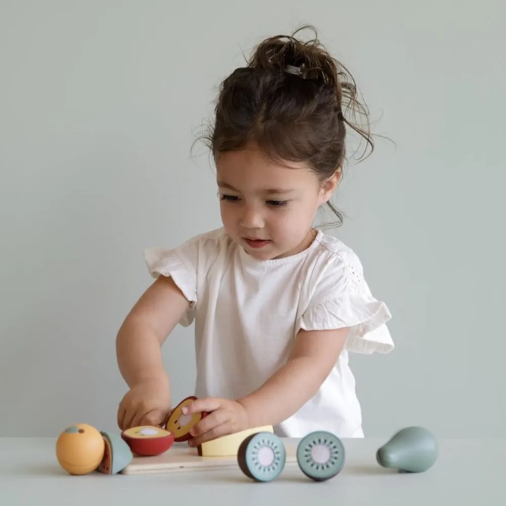 Spis frugt hver dag! Dit barn vil elske at kopiere dig til at tilberede en række frugter med dette søde træ sæt med 6 forskellige frugter. Der medfølger et skærebræt og en trækniv til at dele frugterne i to og afsløre indersiden. Hvad er din favorit? Æble, banan, kiwi, pære, appelsin eller en skive vandmelon? Alle frugterne kan nemt sættes sammen igen med velcro.