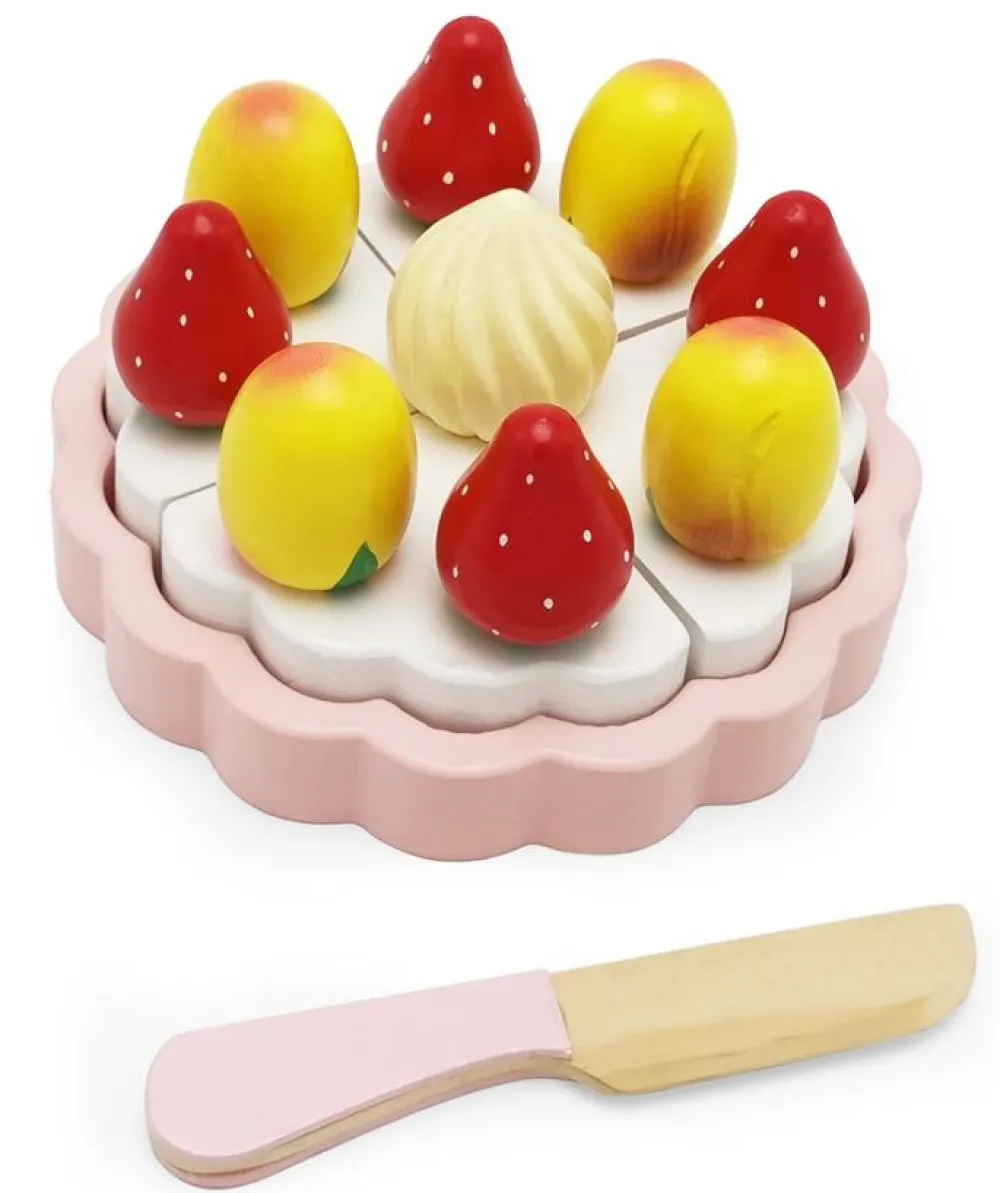 Ferskenkage i træ med velcro. Kagen kommer med en fin tallerken og paletkniv, så du er klar til at holde fest med masser af gæster. Alle stykkerne holdes sammen med velcro.