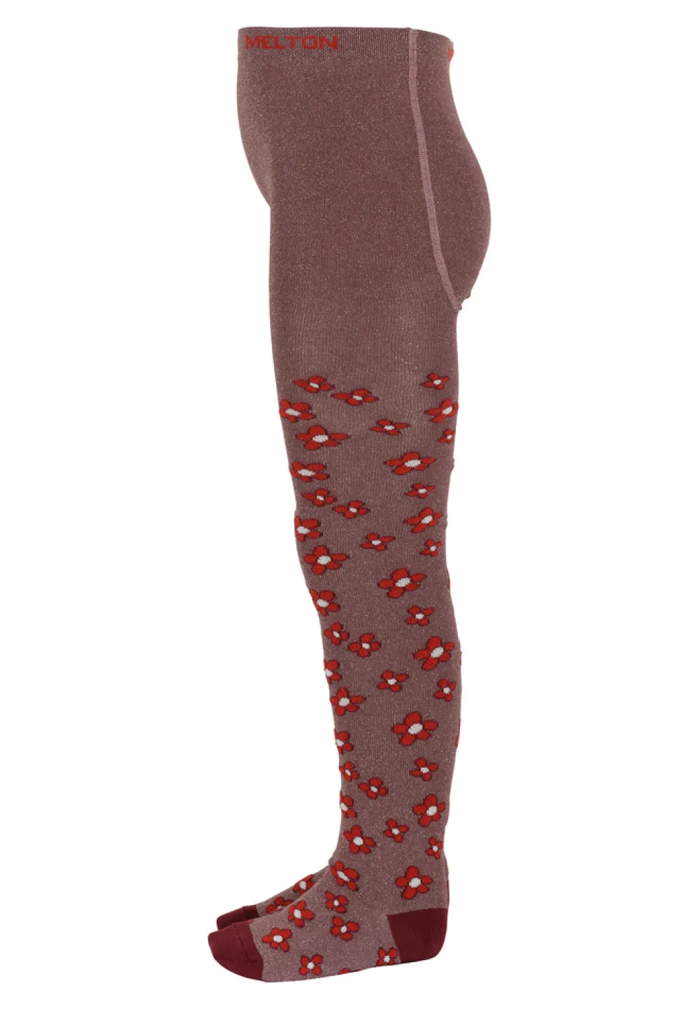 Bomuldstights med glimmer fra MELTON. Tightsene har fine funklende blomster samt hæl, tå og elastisk kant i kontrastfarver. Tightsene er strikket med bomuldsgarn i bunden, så de føles bløde mod barnets hud.