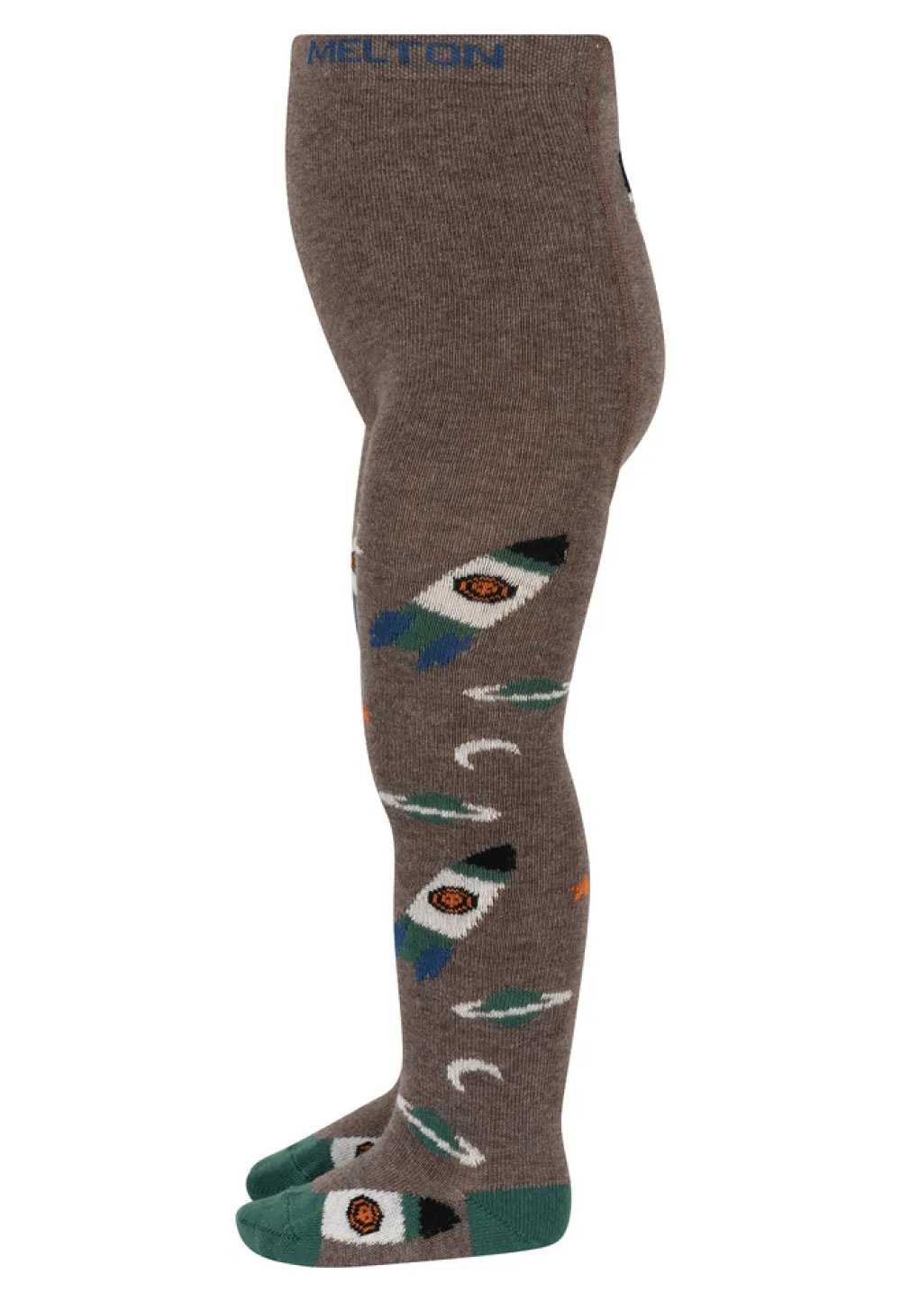 Bomuldstights fra MELTON. Tightsene er dekoreret med rumraketter, planeter og stjerner samt en større raket på bagsiden.