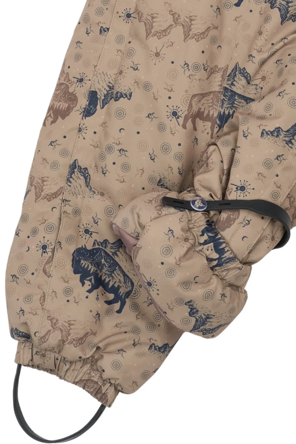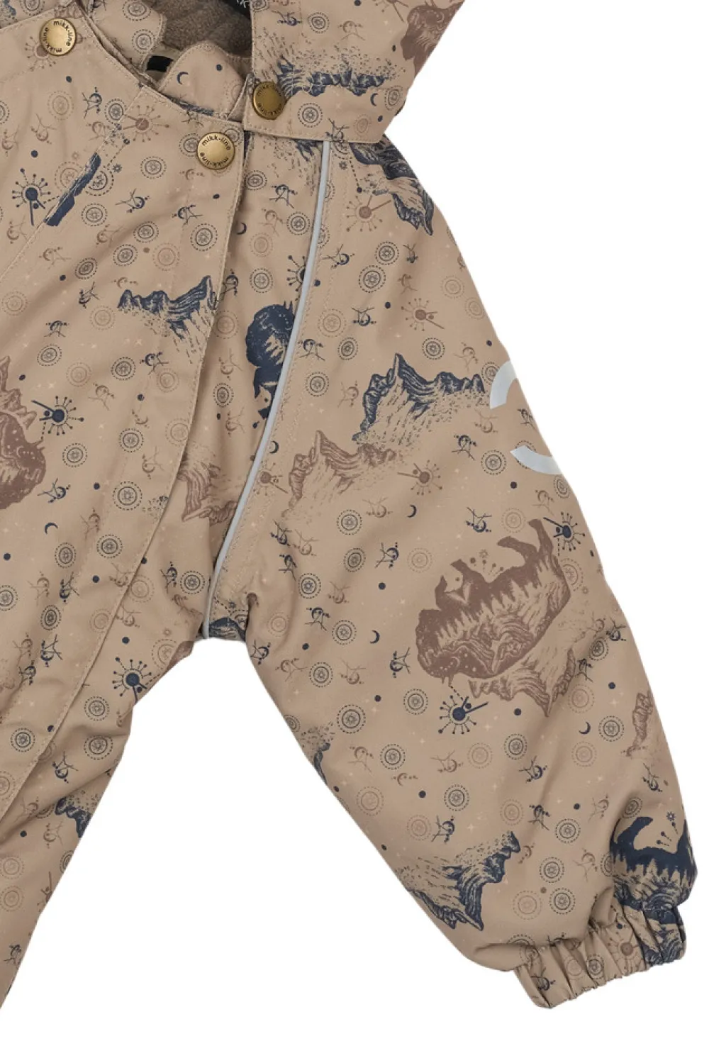 Mikk-line baby flyverdragt med et sejt print af vinterlandskab og skovens dyr. I denne lækre flyverdragt kan barnet lege og udforske naturen under den åbne himmel i alt slags vejr i løbet af de kolde og våde efterår- og vintermåneder. Flyverdragten er lavet af genanvendt polyester og polstret med polyesterfyld. Hætten og overkroppen har blødt fleece foer, hvorimod ærmerne og benene har en glat og gnidningsfri indvendig overflade. Vi har anvendt Solution Dye til farvning af det glatte for, da det bl.a. mindsker forbruget af vand i produktionen. Den er naturligvis også fluorfri med BIONIC-FINISH® ECO imprægnering.