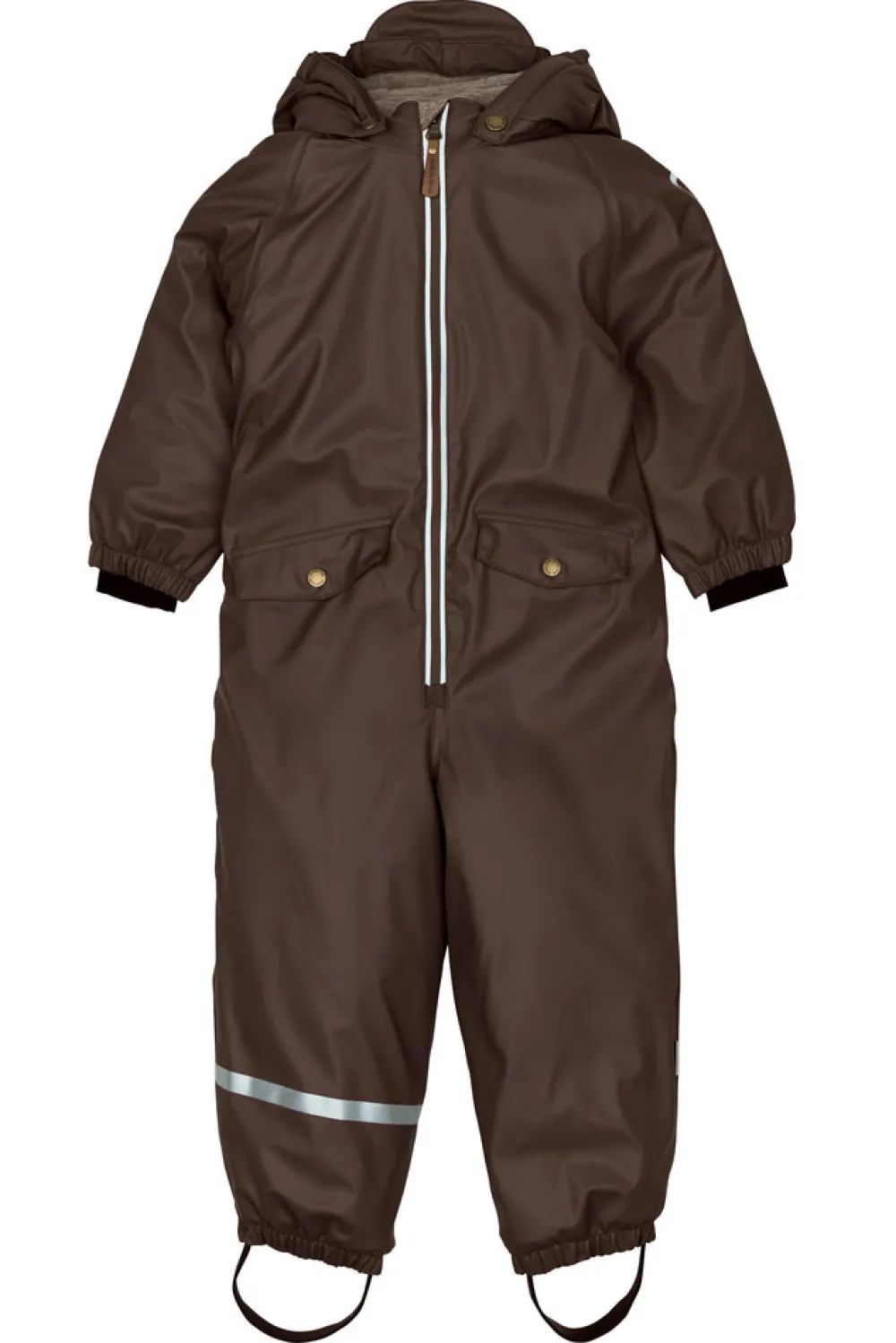 Denne praktiske dragt er lavet af 100% genanvendt polyester med blød polyurethan (PU) coating og polstret med polyesterfyld, så den holder barnet tør og varm. Overkroppen, hætten, kraven, og lommerne har ligeledes blødt fleece foer, hvorimod ærmerne og benene har en glat og gnidningsfri indvendig overflade.