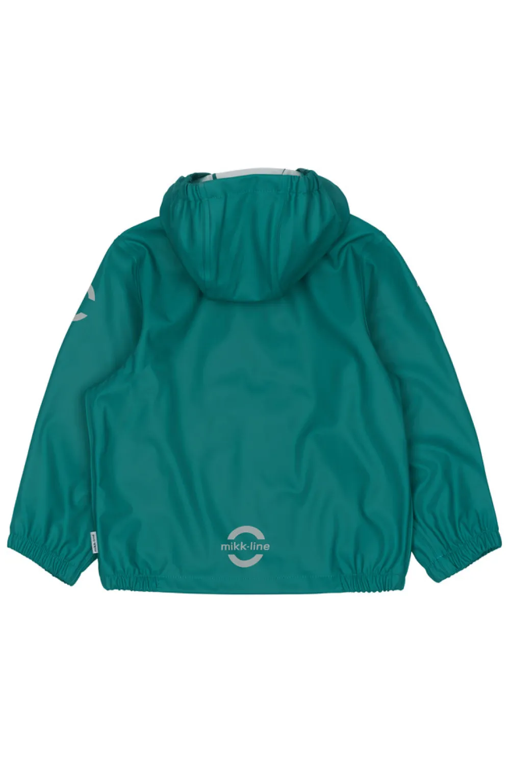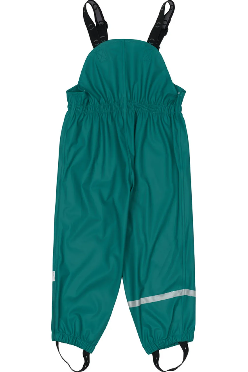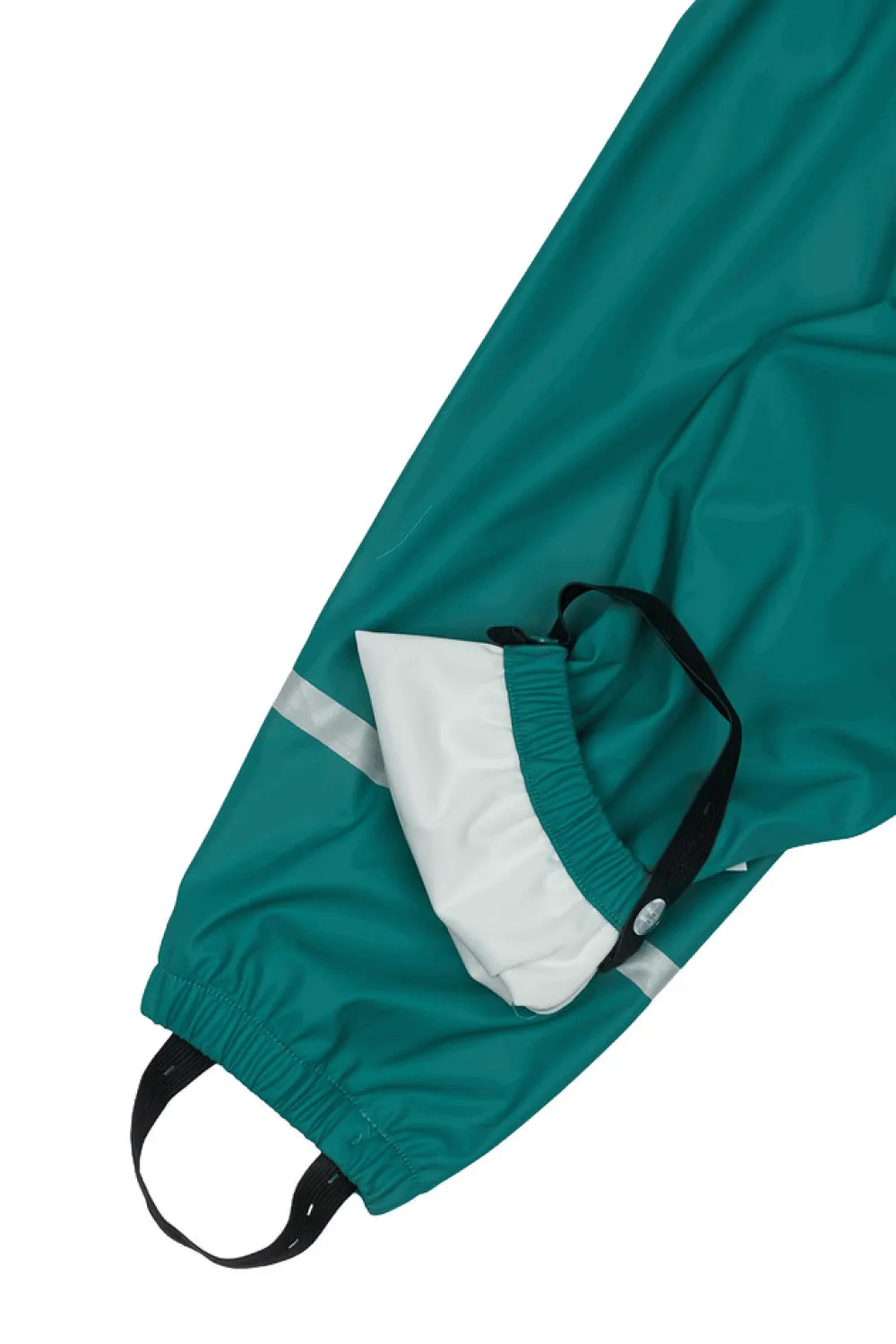 Praktisk og funktionelt recycled regnsæt fra mikk-line, der holder dit barn tørt. Regntøjet er udstyret med refleksdetaljer så dit barn kan færdes sikkert i mørket. Regnsættet er naturligvis både vand- og vindtæt. Sømmene er svejsede, hvilket forhindrer vand i at trænge igennem samlingerne. Buksen har fodstropper, som holder buksen under gummistøvlen. Regnbukserne har justerbare seler, tætsiddende elastik i taljen og et ekstra stykke stof der dækker både foran og bagpå kroppen.