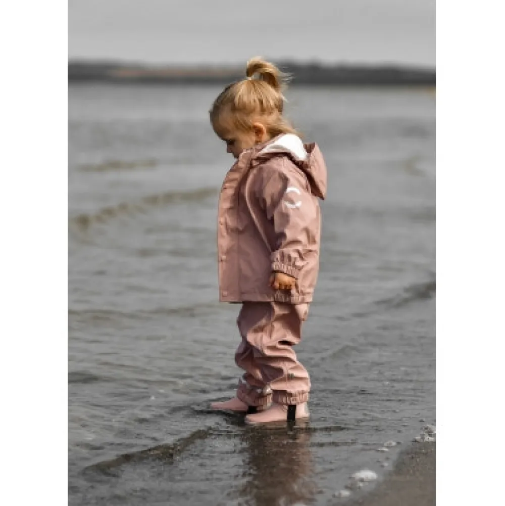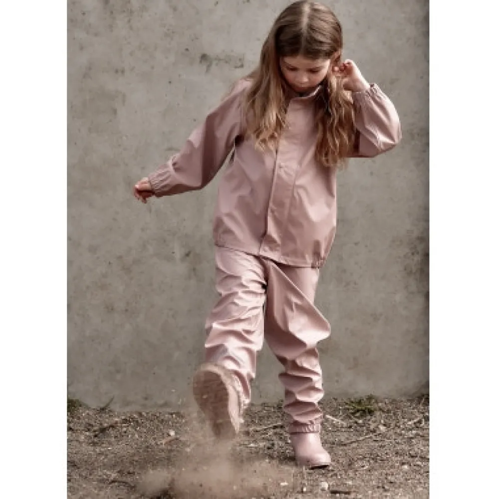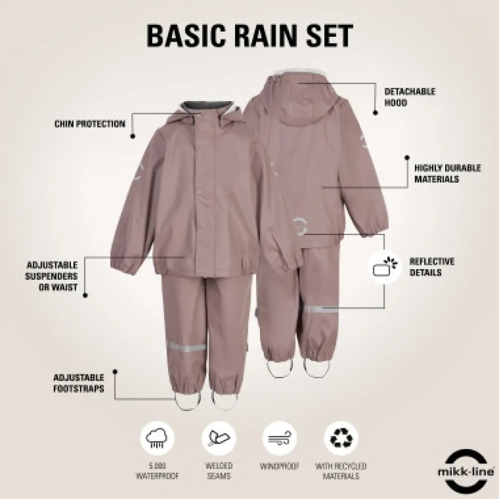 Klassisk PU regntøj uden seler fra mikk-line. Sættet består af en vandtæt regnjakke og regnbukser, der begge er lavet af 100% genanvendt og blødt PU-materiale. Regntøjet er skabt til at børn kan trodse regnen og have det sjovt med at hoppe i vandpytter, glide ned ad den våde rutsjebane, lege i den våde sandkasse osv. Placer de justerbare fodstropper under støvlerne, for at holde fødderne tørre og undgå at bukserne glider op. Buksernes taljeomkreds kan tilpasses efter behov, og så har sættet har et indvendigt navneskilt med plads til mere end ét navn, så giv det gerne videre, så endnu et barn kan få glæde af det.