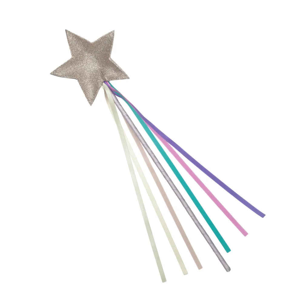 Spred magisk støv med denne fine tryllestav med en stor, glitrende stjerne på toppen og en hale af 6 farverige satinbånd. Stjernen er placeret sikkert på en pind, betrukket med satinbånd.
