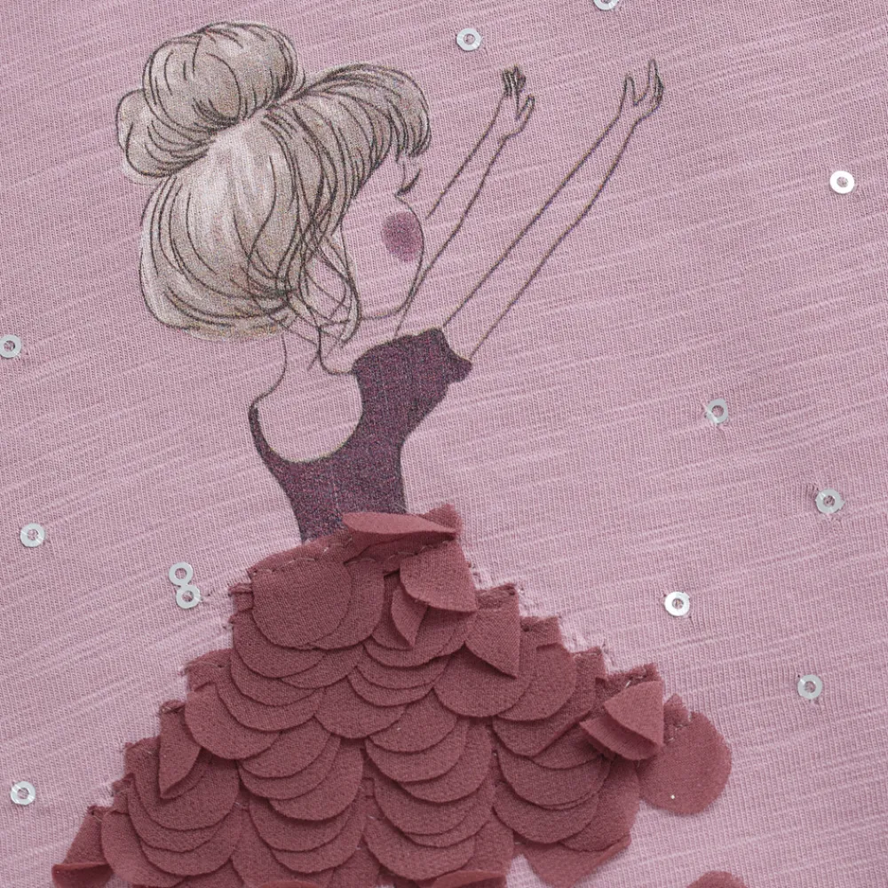 Langærmet bluse fra Minymo med et sødt og elegant udtryk. De fine flæsedetaljer ved skuldrene tilføjer et feminint touch, mens det midterste print af en ballerina med 3D-effekter og små pailletter skaber et legende og drømmende look.