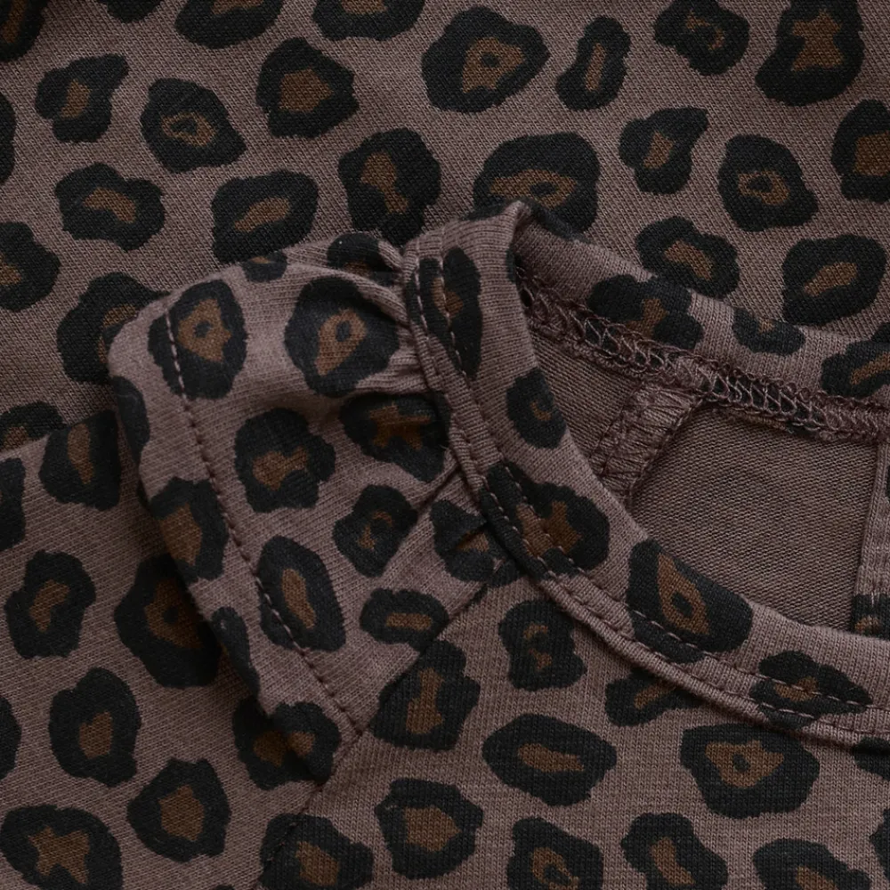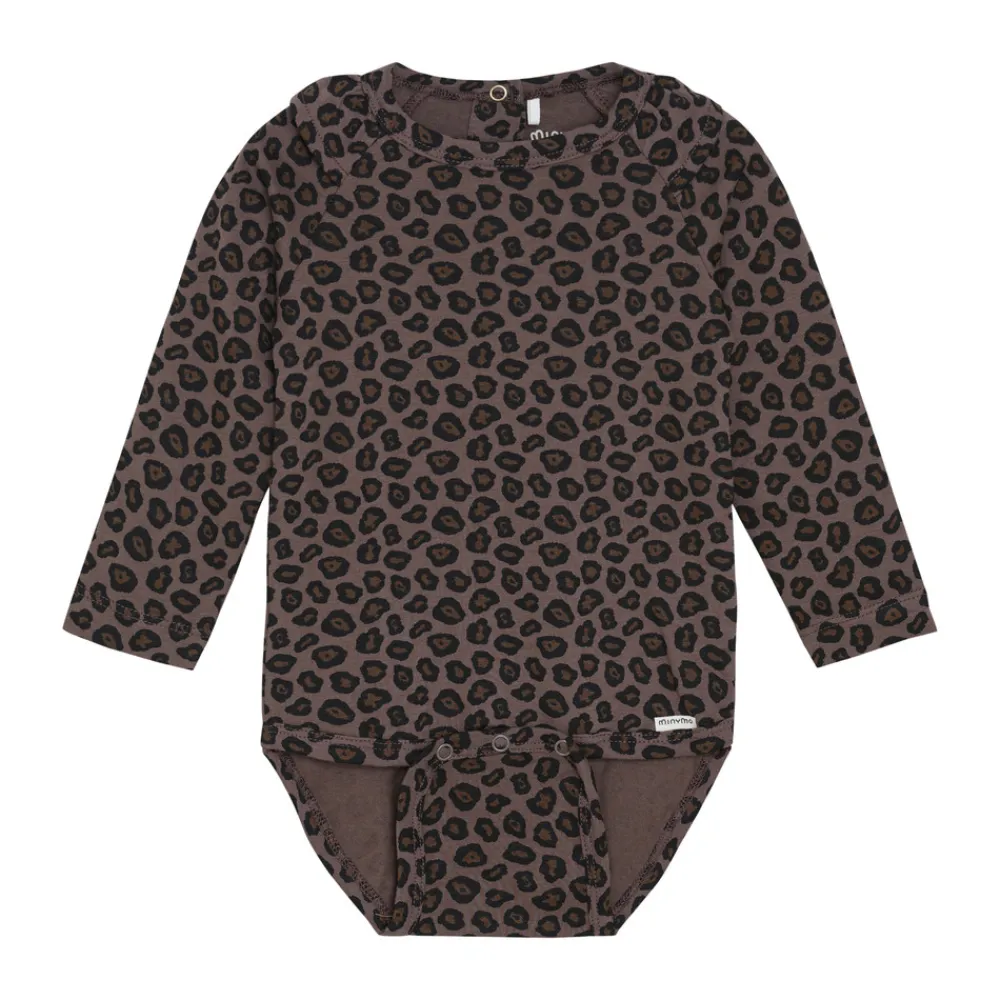 Minymo langærmet body med leopardprint – økologisk bomuld Denne fine body fra Minymo er både praktisk og stilfuld. Den har lange ærmer, søde detaljer ved skuldrene og et moderne all-over leopardprint. Bodyen lukkes nemt med trykknapper i ryggen og mellem benene – perfekt til hurtige skift. Fremstillet i en blød, økologisk bomuldsblanding, der er skånsom mod barnets hud.