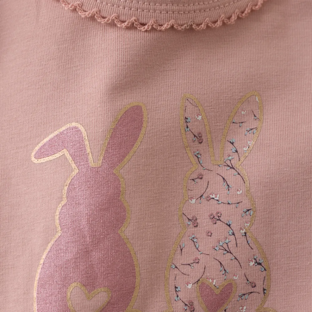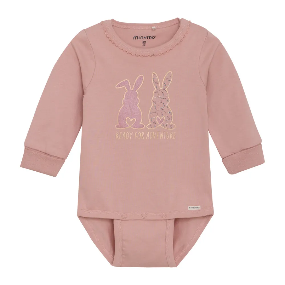 Langærmet body fra Minymo med et sødt print. Bodyen er fremstillet i en blød bomuldsblanding, der føles behagelig og skånsom mod barnets hud. Den er designet med trykknapper mellem benene, placeret i to forskellige positioner, så bodyen kan justeres og vokse med barnet. Et lille Minymo-logo ved benet fuldender det fine udtryk.