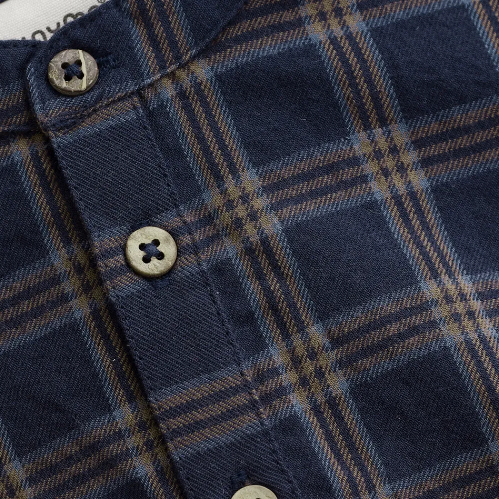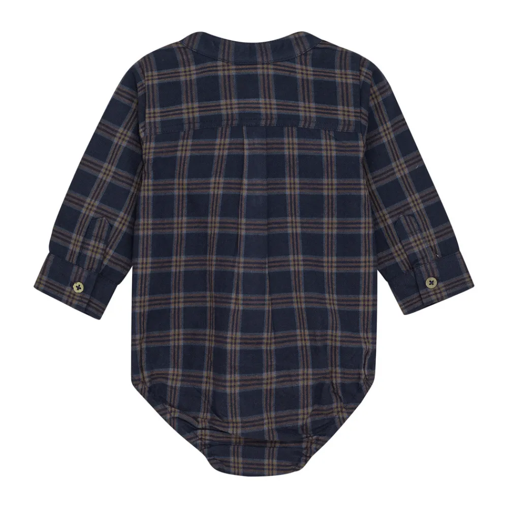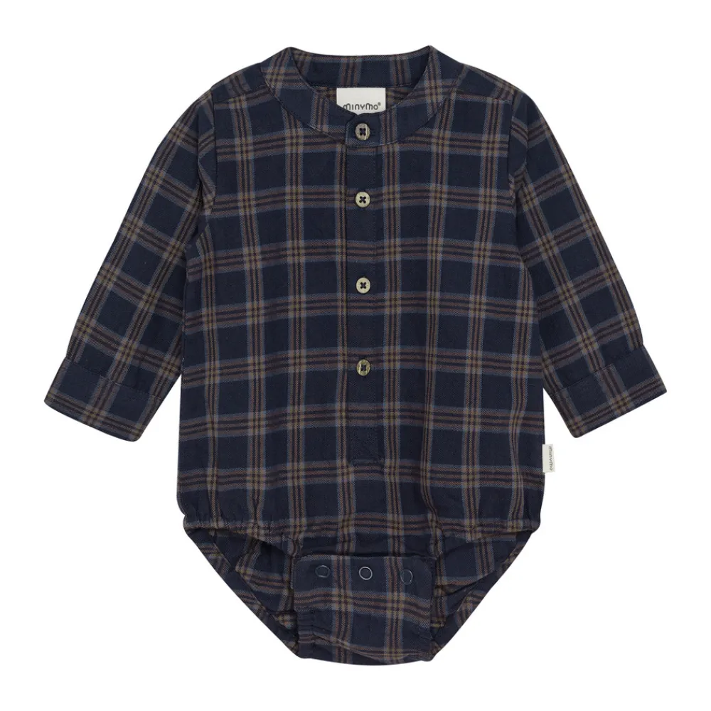 Denne stilfulde langærmede body fra Minymo kombinerer et tidløst ternet all-over design med praktiske detaljer. De gennemgående knapper foran giver bodyen et skjorteinspireret look, der både er sødt og funktionelt.