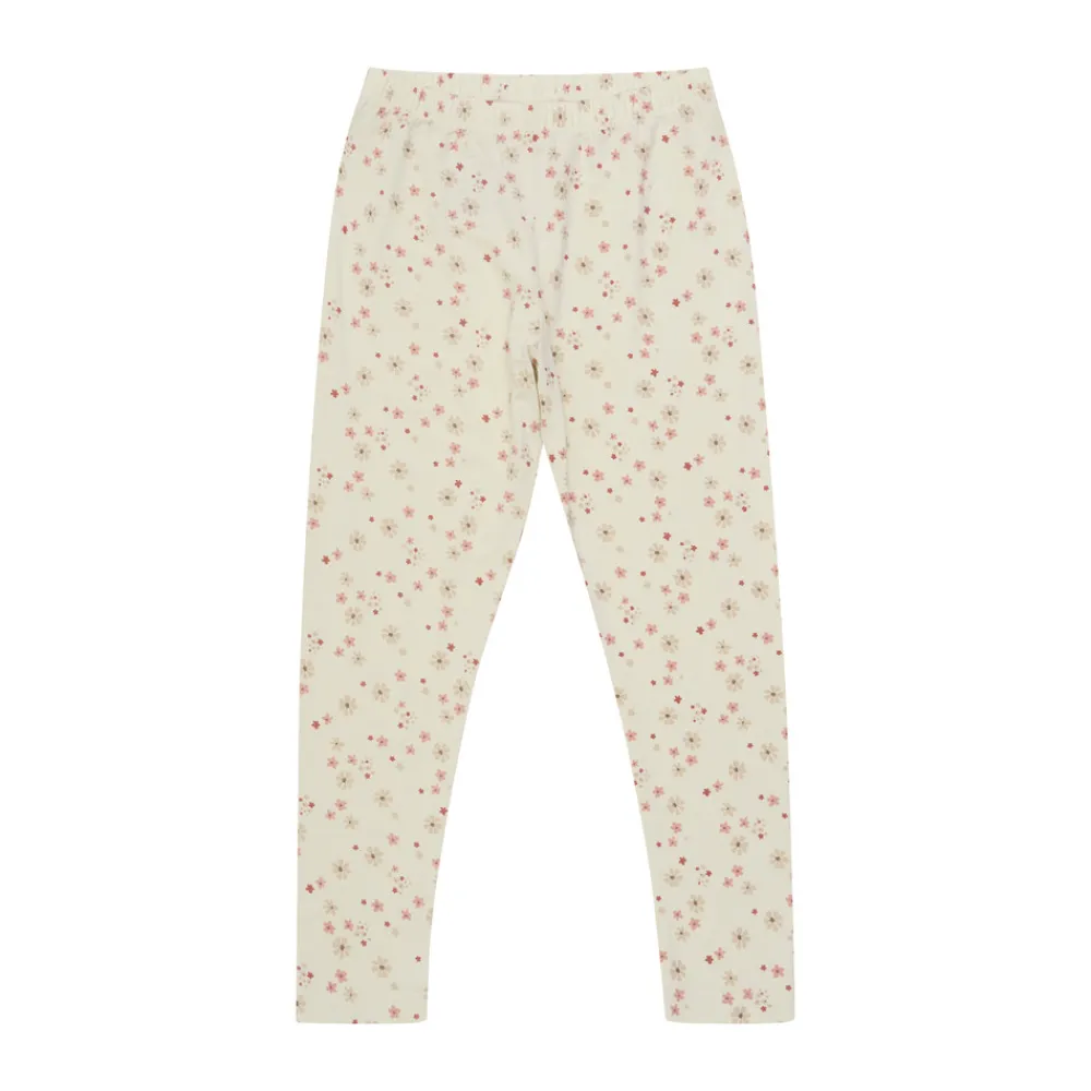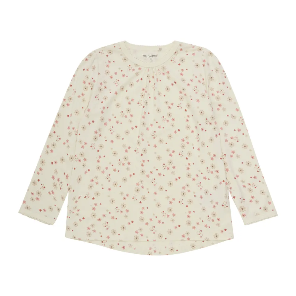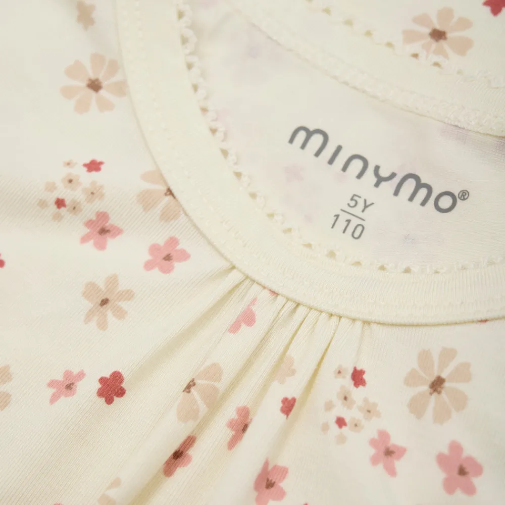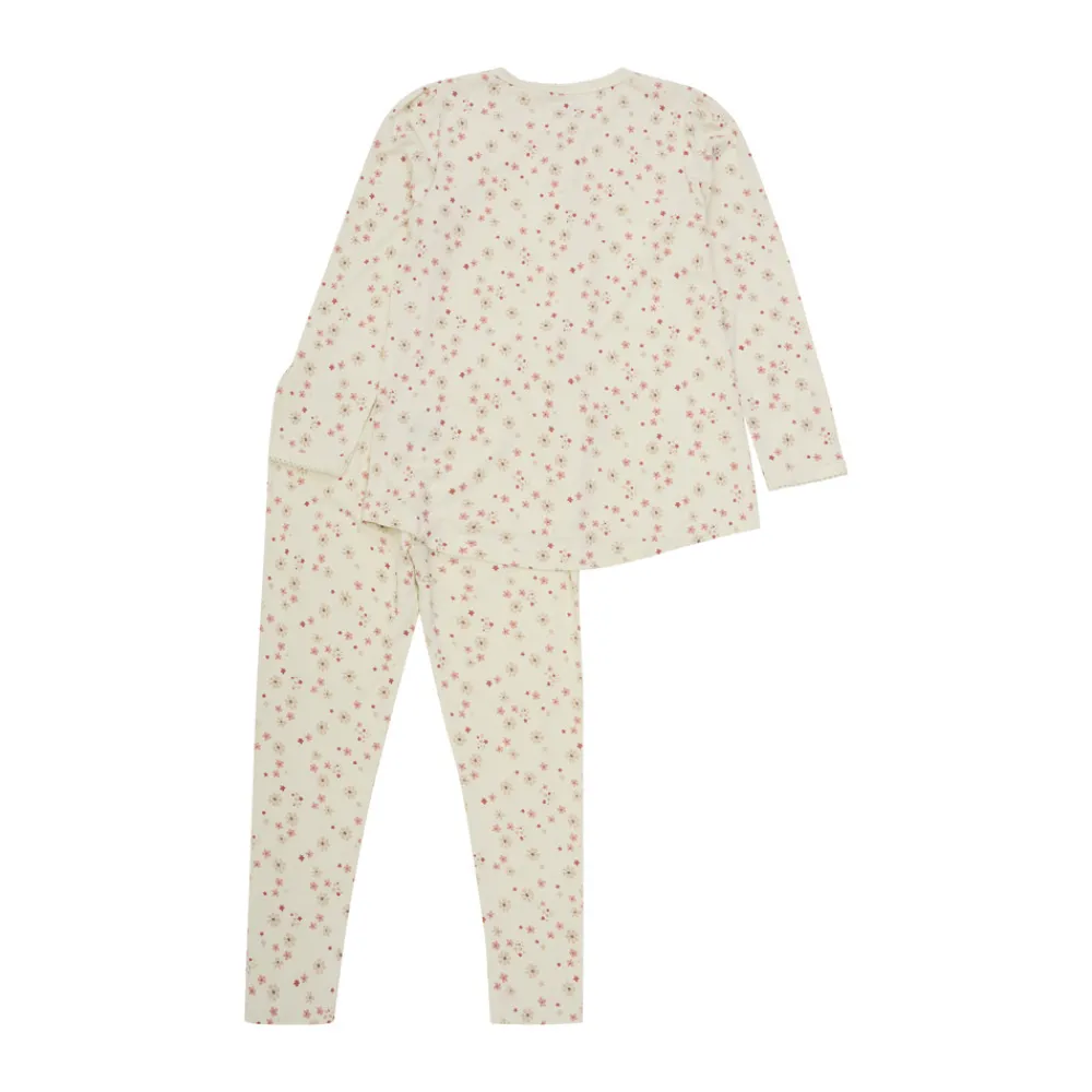 Sødt Minymo nattøj, bestående af en natbluse og natbukser i cremehvid med et fint allover jordbærprint i rød og beige.