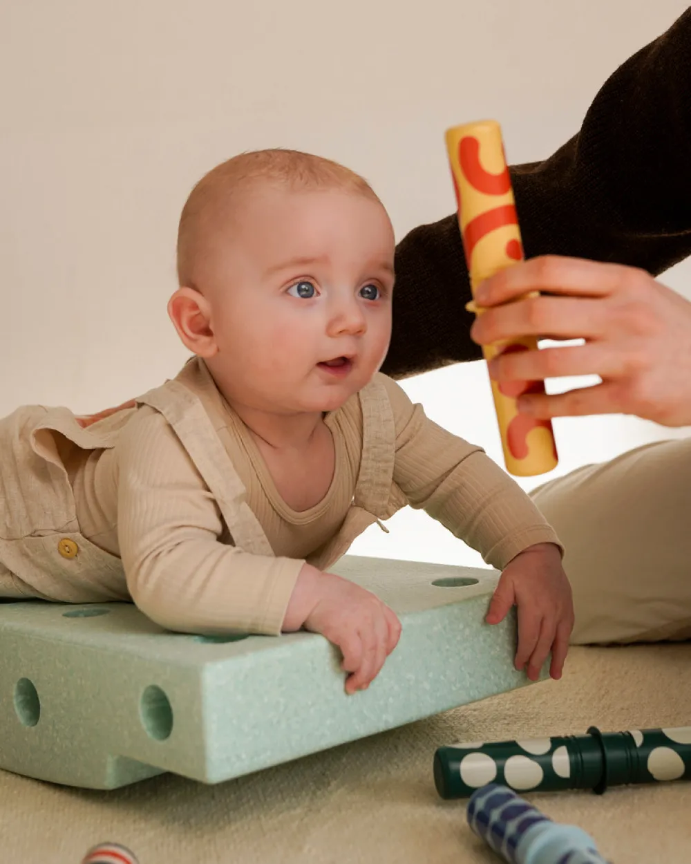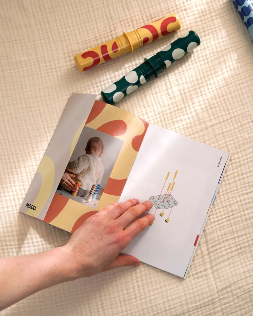 MODU baby motoriksæt — 12 sjove øvelser til de første 12 måneder af livet. Produktet er designet af eksperter i babyudvikling og indeholder en omfattende guide med billeder og vejledninger, der følger din babys vigtige motoriske milepæle; fra mavetid til kravl og videre. I pakken modtager du også specielt designet raslepinde med unikke lyde og mønstre, som giver både visuel og sanselig stimulans. Velkommen til et år fyldt med sjov, leg og udvikling!