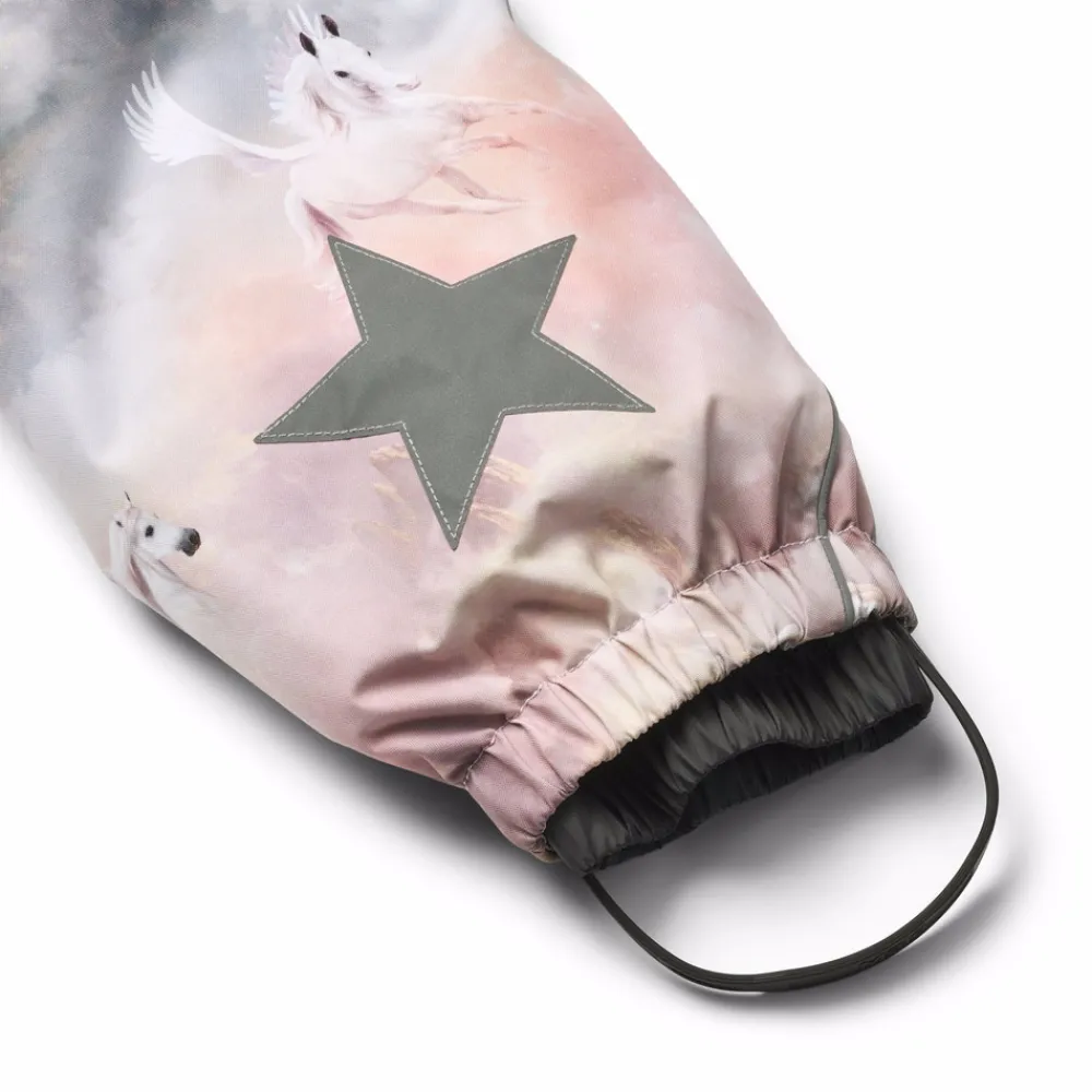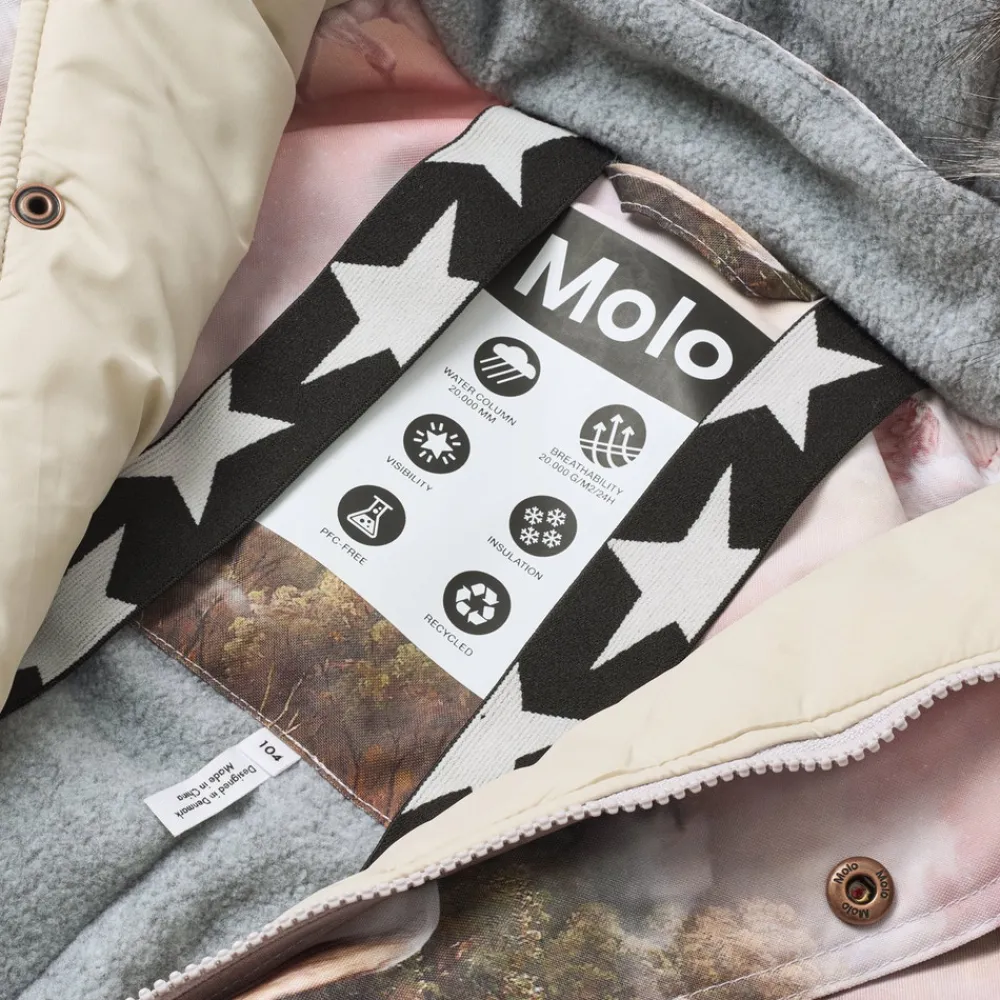 Indvendige elastikstropper og elastik ved ærme- og ben åbninger sikrer, at dragten sidder godt og effektivt holder sne, regn og vind ude. Refleksbånd og to store stjerner på benene øger synligheden i trafikken. Dragten er foret med genanvendt polyesterfleece på udsatte områder og isoleret med 3M™ Thinsulate™, som holder barnet varmt – selv i temperaturer helt ned til -25 °C.