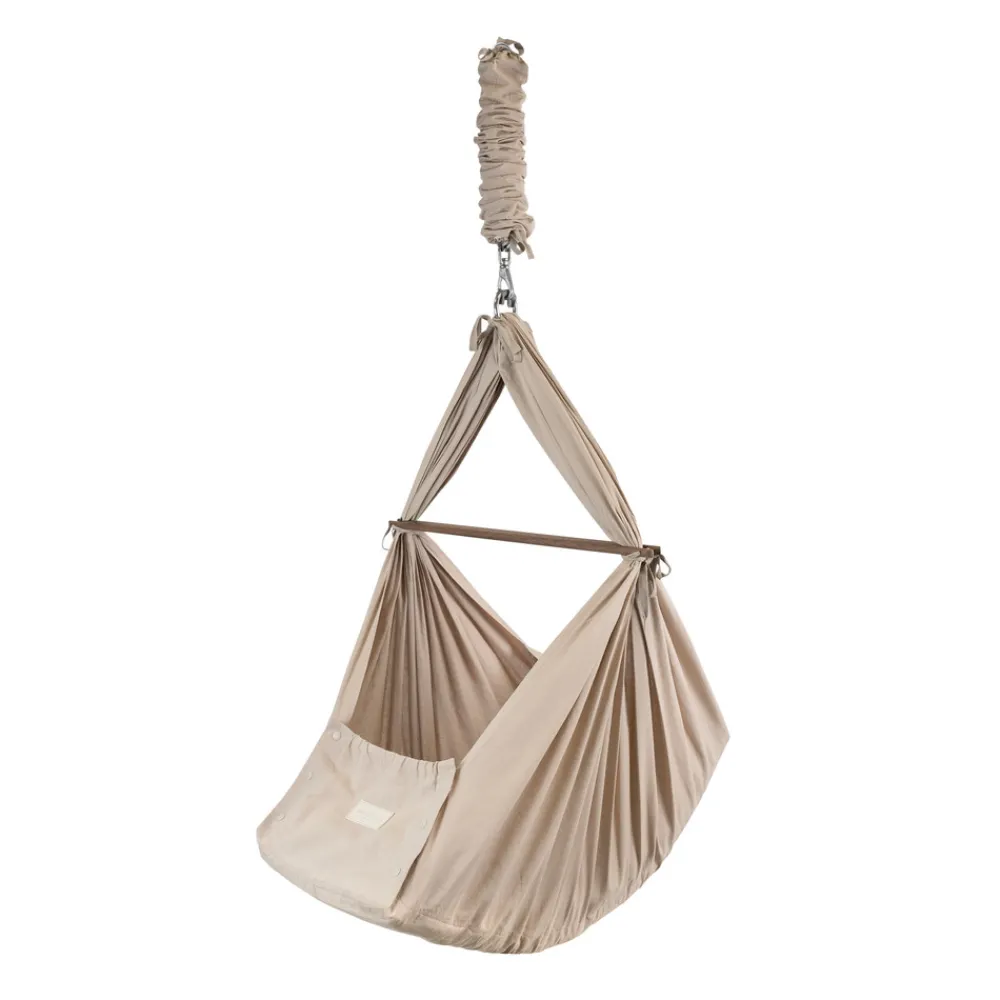 Økologisk – Naturlig og ElegantDen ergonomiske slyngevugge er skabt med særligt fokus på at understøtte udviklingen af barnets rygsøjle. I kan derfor have glæde af den populære seng allerede fra barnet er nyfødt og til 15 kg. Stofsiderne er lavet af blødt økologisk bomuld, så barnet blidt omkranses af det behagelige og GOTS-certificerede materiale. En elegant tværpind udført i smukt, mørkt valnøddetræ afstiver toppen, og vuggens bund er en allergivenlig madras fyldt med naturmaterialet kapok. En CE-mærket Moonboon Fjeder med sikkerhedsstrop garanterer en blød vugning, der får barnet til at sove trygt. Fjederen kan vugge med en belastning på op til 15 kg., og er elegant skjult i et stofdække, så slyngevuggen er flot at have hængende i hjemmet.
