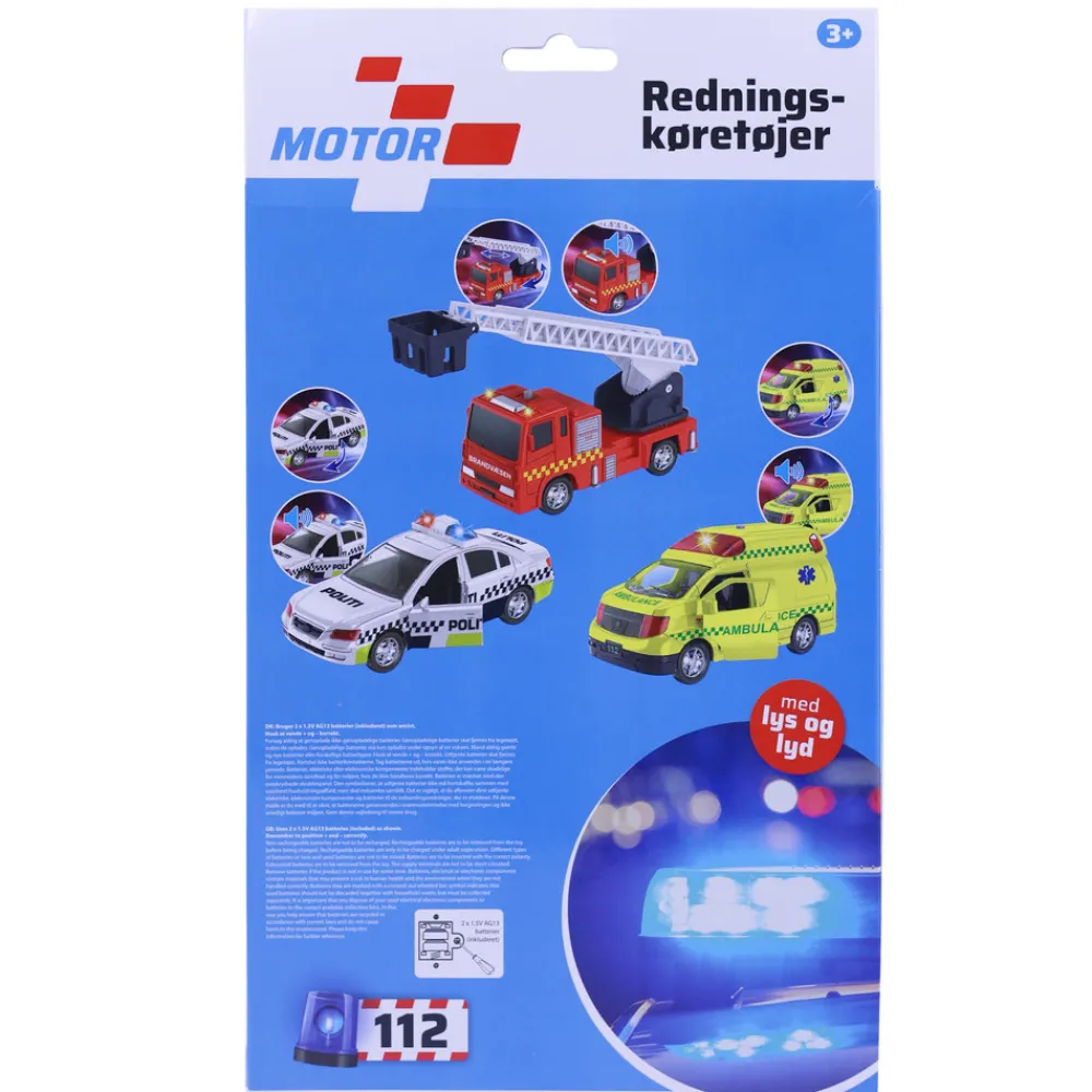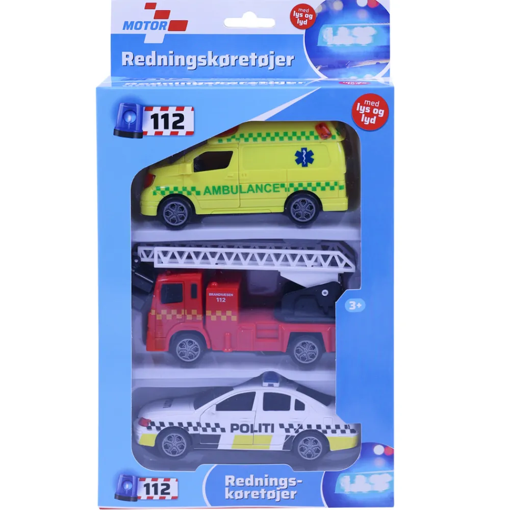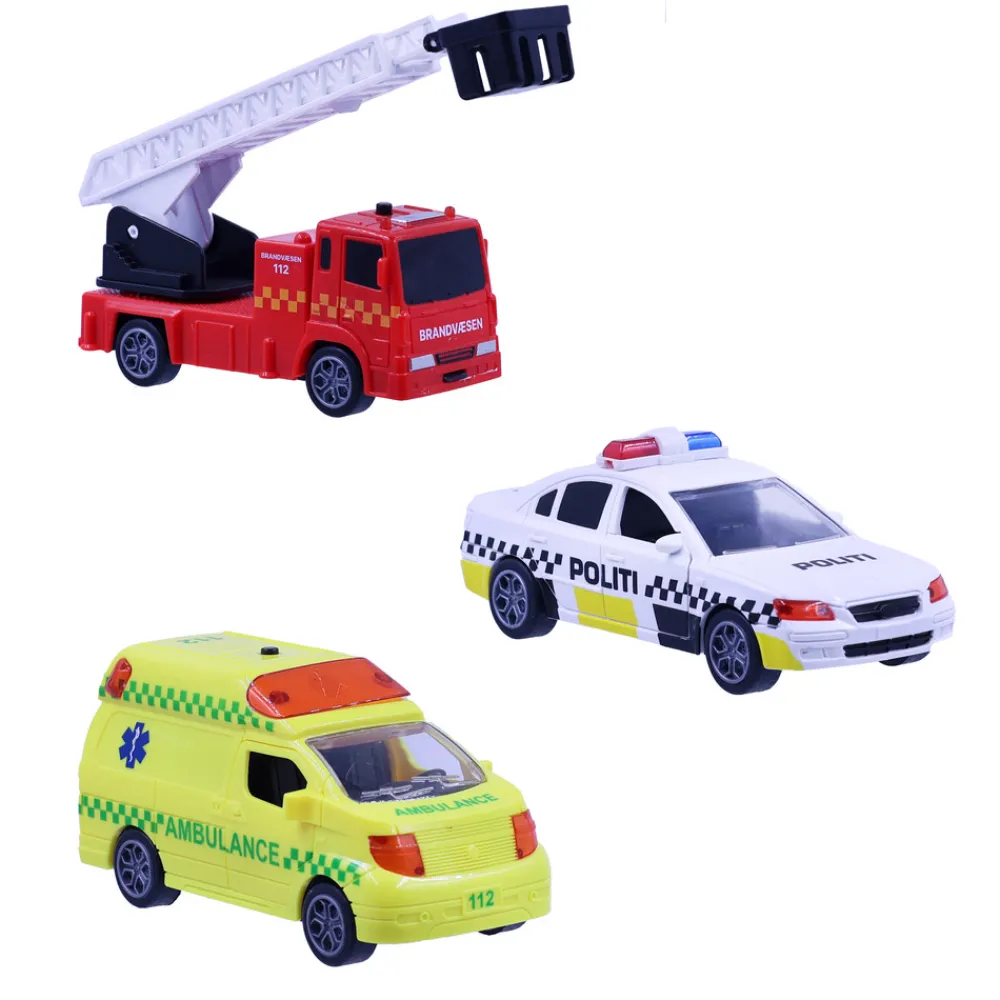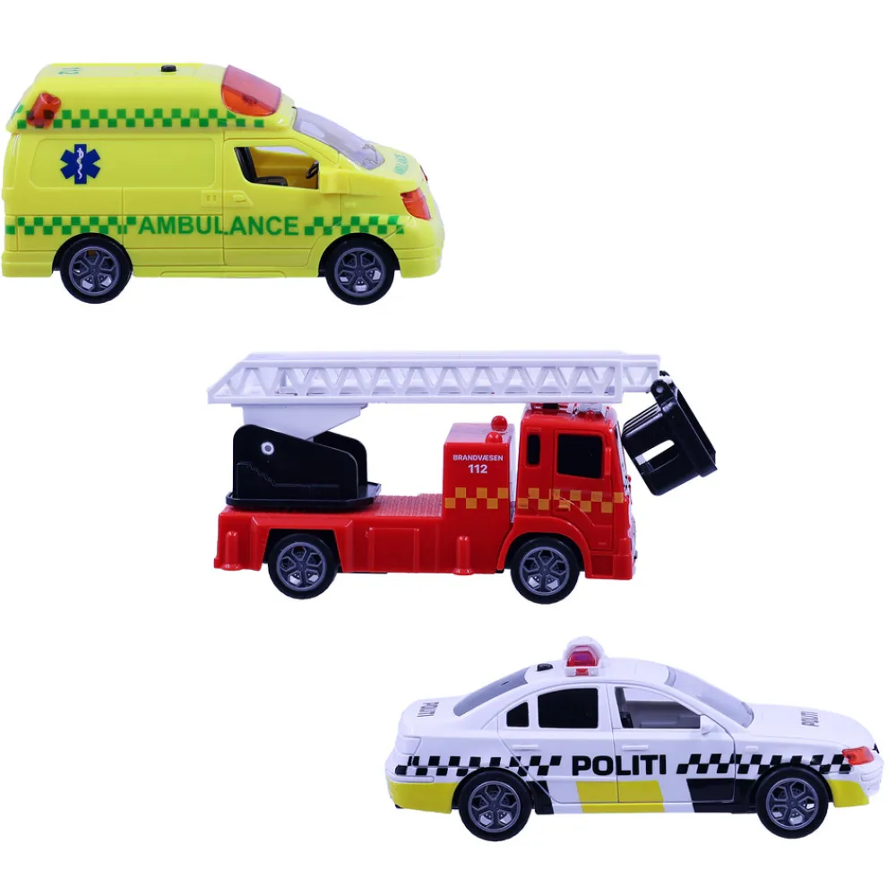 Denne 3-pak byder på mange timers leg og underholdning, og er den perfekte gave til de små poder som elsker udrykningskøretøjer. Pakken indeholder en ambulance, en brandbil og en politibil, der alle er udstyret med lys og lyd samt bevægelige dele. Derudover er køretøjerne også udstyret med pullback-funktion.