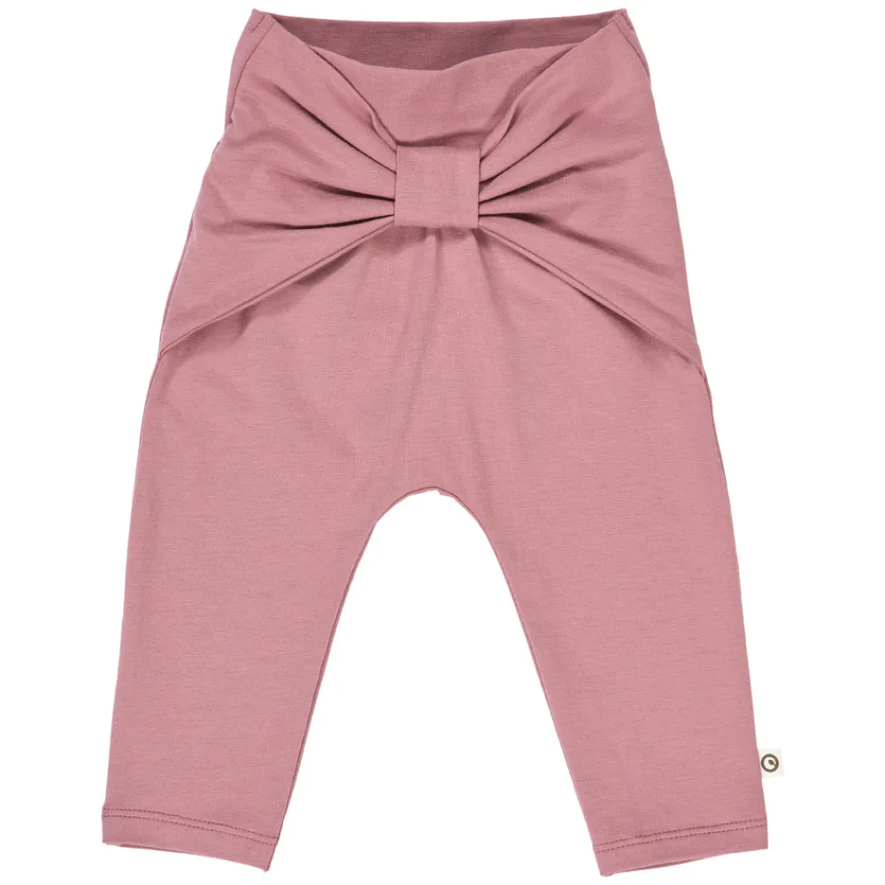 Disse skønne bukser har et sødt og feminint udtryk med en fin sløjfe foran, der tilføjer et charmerende touch. Den brede, elastiske taljekant sikrer en behagelig pasform uden at stramme, og den bløde, strækbare kvalitet giver barnet stor bevægelsesfrihed og komfort hele dagen.
