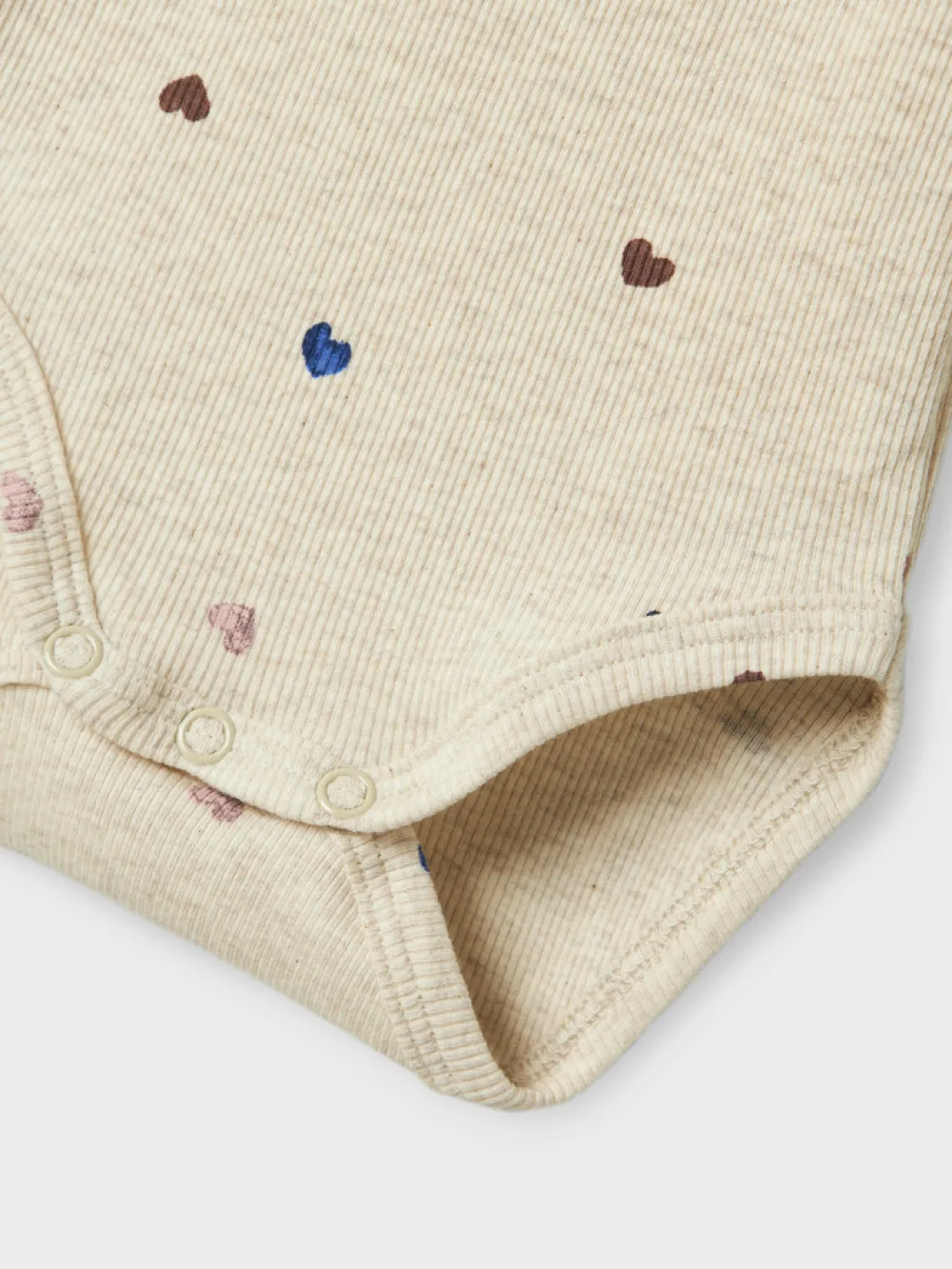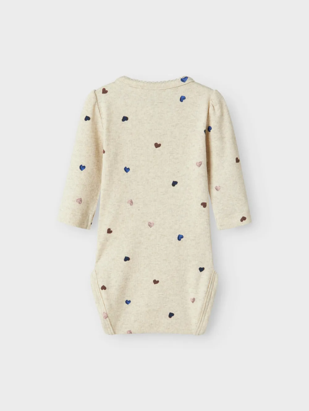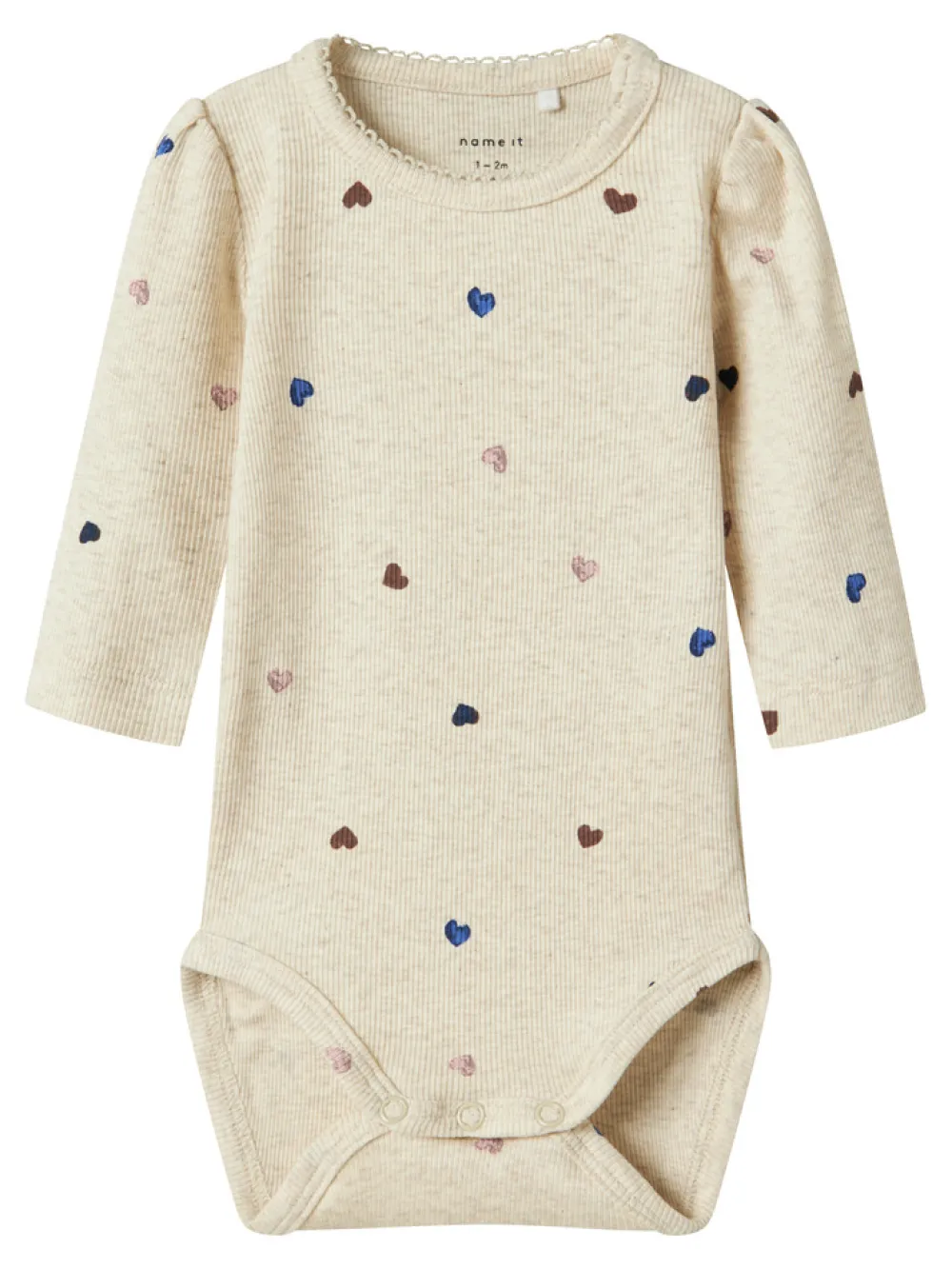 Friske dit barns garderobe op med bløde og praktiske bodysuits, der er perfekte til brug året rundt.Ribstrikket har et lodret stribet mønster og god elasticitet for en behagelig pasform og et tidløst look.- Produkttype: Body- Halsudskæring: Rund halsudskæring- Ærme: Lange ærmer (L/S) med puffer- Lukning: Trykknapper- Tryk: Tryk over hele produktet