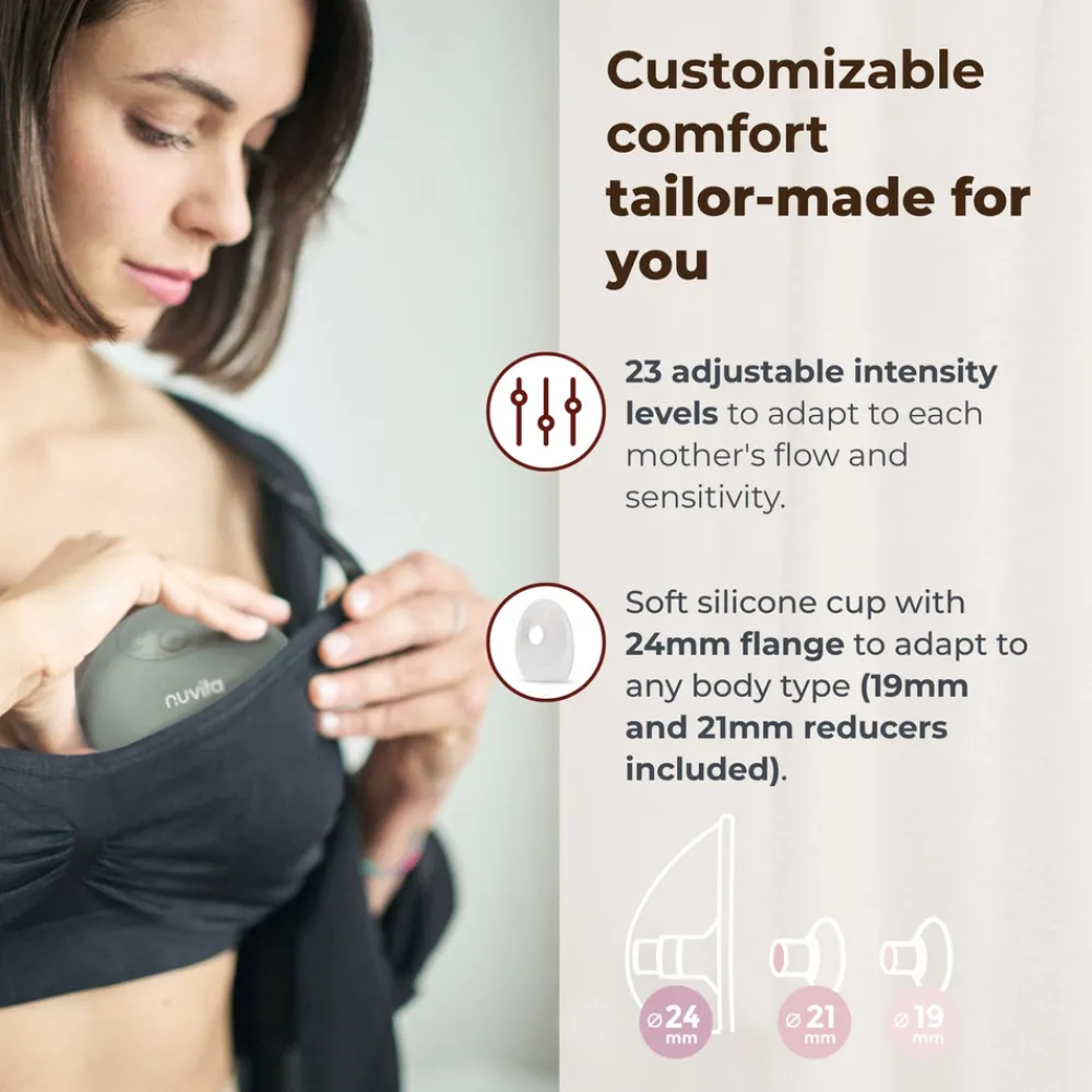 Den ergonomiske kop er lavet af blødt silikone, der er skånsomt mod huden, med en 24 mm flange, og pakken indeholder allerede 2 indsatser (19 mm og 21 mm), der passer perfekt til alle bryster. Materno Flow er støjsvag, let og kompakt med en integreret motor og kan bæres diskret under tøjet – ideel til brug i hjemmet, på rejser eller til daglige aktiviteter.