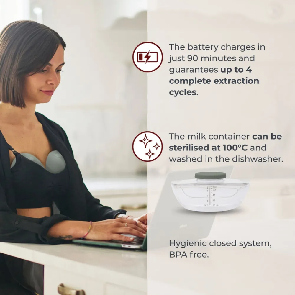 - Det genopladelige lithium batteri giver op til 4 komplette pumpecyklusser, så mødre kan bruge det hele dagen.
