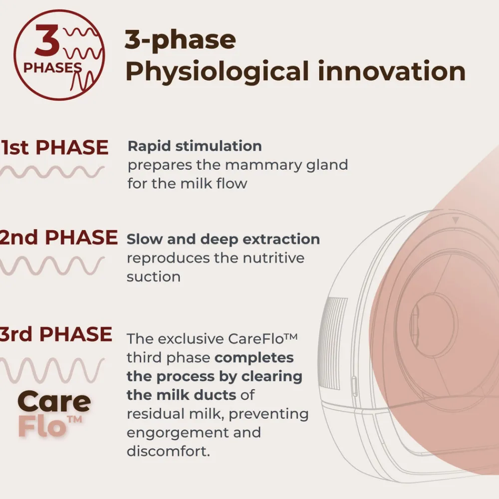 CareFlo™ er Nuvitas eksklusive teknologi, der tilføjer en tredje dræningsfase til den klassiske tofasede pumpning (stimulering + udmalkning). Denne sidste fase er udviklet i overensstemmelse med anbefalinger fra Verdenssundhedsorganisationen og IBCLC-certificerede ammevejledere og renser mælkekanalerne fuldstændigt for resterende mælk, hvilket hjælper med at forhindre mælkeophobning og mastitis. Derudover understøtter den mælkeproduktionen og letter opretholdelsen af eksklusiv amning.