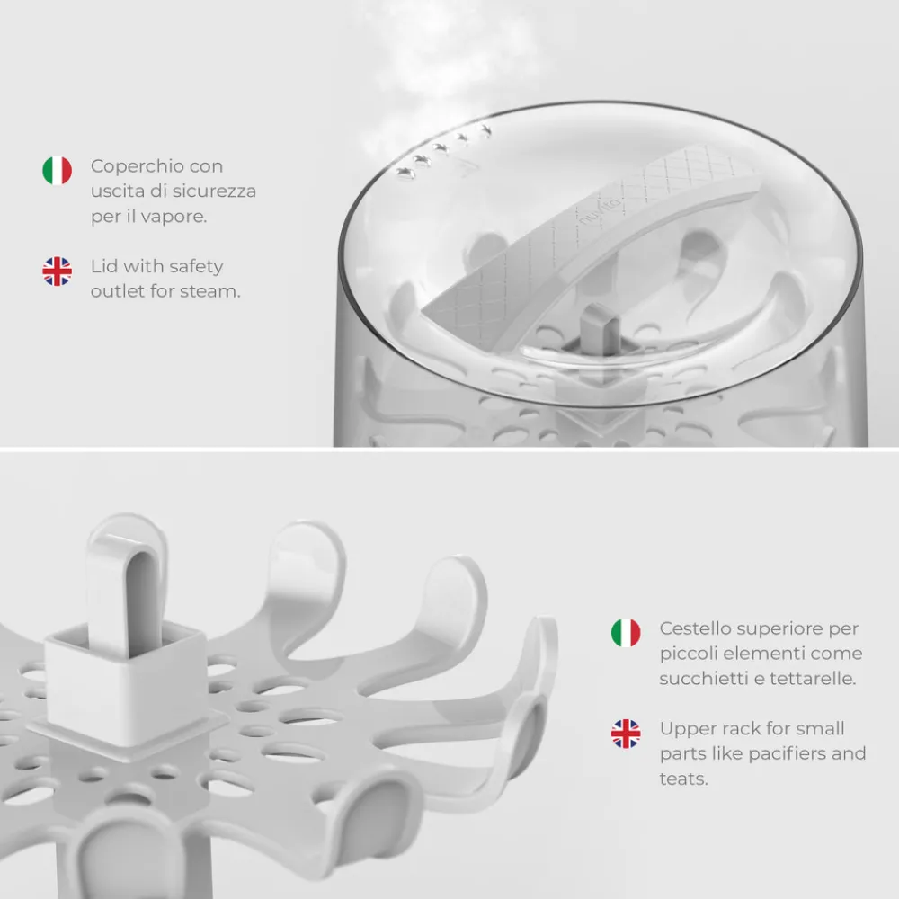 BPA-fri dampsterilisator, der kan sterilisere op til 6 sutteflasker, brystpumper og alt tilbehør velegnet til dampsterilisering på kun 6 minutter. Når steriliseringscyklussen er færdig udsendes en akustisk lyd, og indeholdet forbliver steriliserede i op til 24 timer.