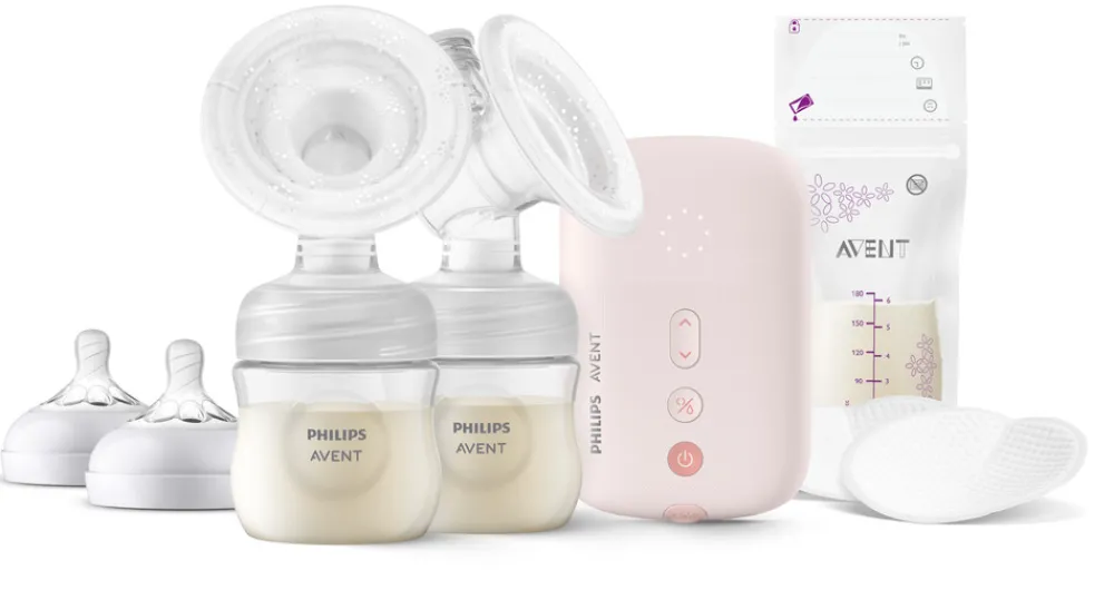 Philips Avent dobbelt elektrisk brystpumpe udpumper mere mælk på kortere tid* og stimulerer naturligt brystet, præcis som en baby gør. Det gør det nemt at kombinere udpumpning med amning. Den bløde og fleksible silikonepude passer til 99,98 % af alle brystvorter (op til 30 mm)**, så den tilpasser sig blidt dit unikke bryst. Brystpumpen har 8 stimulerings- og 16 pumpeniveauer for en personlig oplevelse, og motordelen husker dine sidste indstillinger. Føl dig afslappet, mens du udpumper, takket være en støjsvag motor samt et design der gør, at du kan sidde oprejst i stedet for at læne dig forover. Start/pause-knappen giver dig mulighed for at tage en pause, hvis du har behov for det. Det lukkede mælkesystem betyder, at mælken holdes uden for slangen, så der er mindre at gøre rent. Færre dele gør det også nemt at sætte dem sammen igen. Brystpumpen, flasken og sutten er naturligvis BPA-fri***.