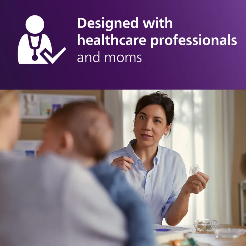 Som nybagt forælder er det afgørende at vælge den rigtige sut til dit barn. Sutten er designet til babyer i alderen 0-6 måneder og har fire ekstra store lufthuller, der lader huden ånde og holder den tør og behagelig – en bekvem funktion ved brug i længere perioder. Den symmetriske silikonesut følger ganens, tændernes og tandkødets naturlige form, og giver komfort og ro i sindet. Den silkebløde silikonesut er designet til at efterligne et moderbryst. Designet er behageligt for barnet, og imponerende 98 %* af babyer accepterer nemt sutten. Sutten er fremstillet af 100 % silikone af medicinsk kvalitet, er slidstærk og BPA-fri. Den er supernem at rengøre og modstandsdygtig over for høje temperaturer, så den kan steriliseres effektivt.