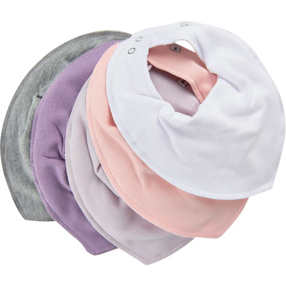 Ensfarvede tørklæde savlesmæk i fine farver som 5-pak i økologisk bomuld og polyester. Smækken består af to lag stof med en membran i midten, der gør dem 100% savletæt. Blødt materiale, som er behagelig for barnet at have på og 2 trykknapper i nakken.