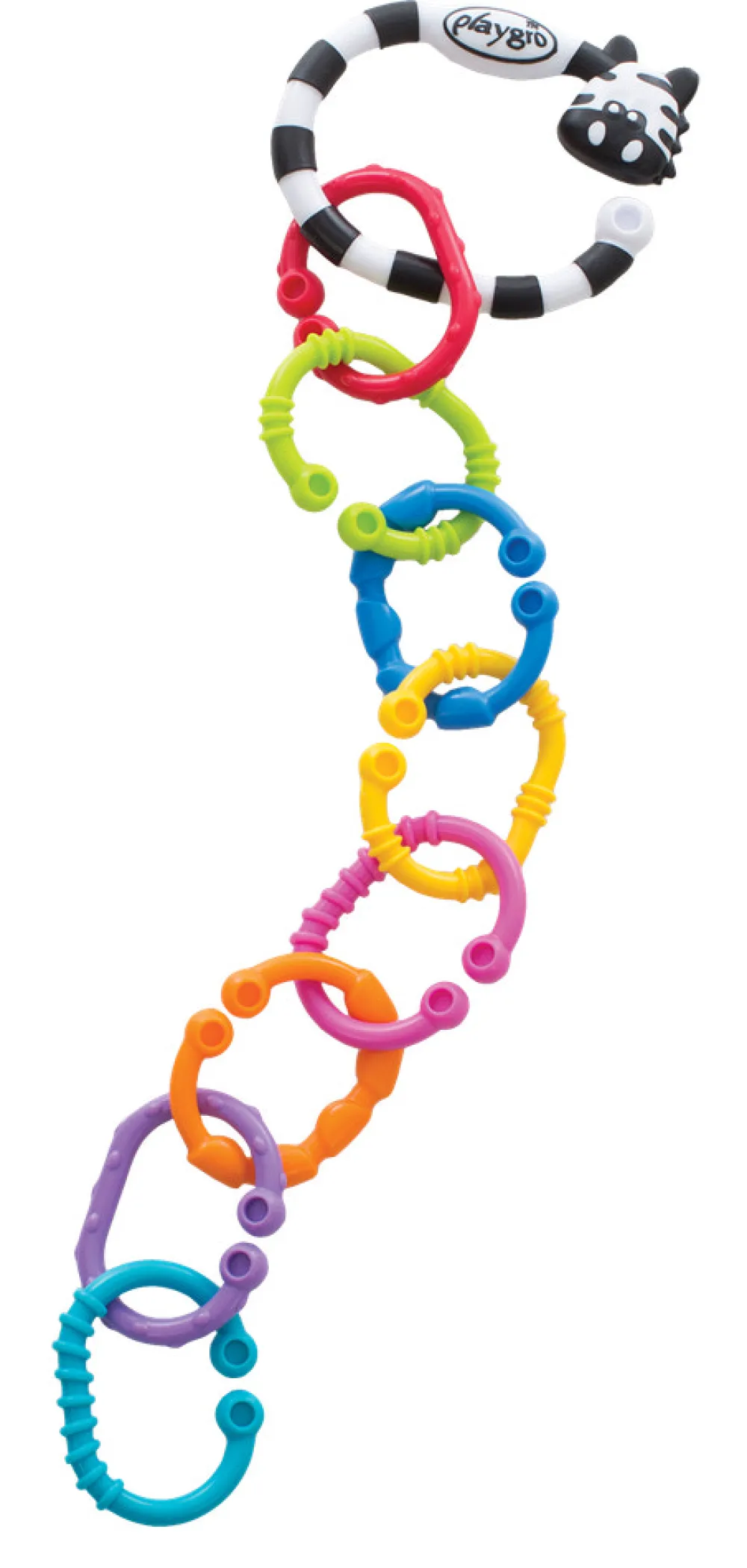 Den fine zebra holder styr på de 8 kædeled. Brug leddene til at hænge babylegetøj med på f.eks. barnevognen. Eller sæt dem sammen til en lang kæde. Både led og zebra fra Playgro kan være dejlig at bide i, når gummerne klør. Fra 0 måneder.