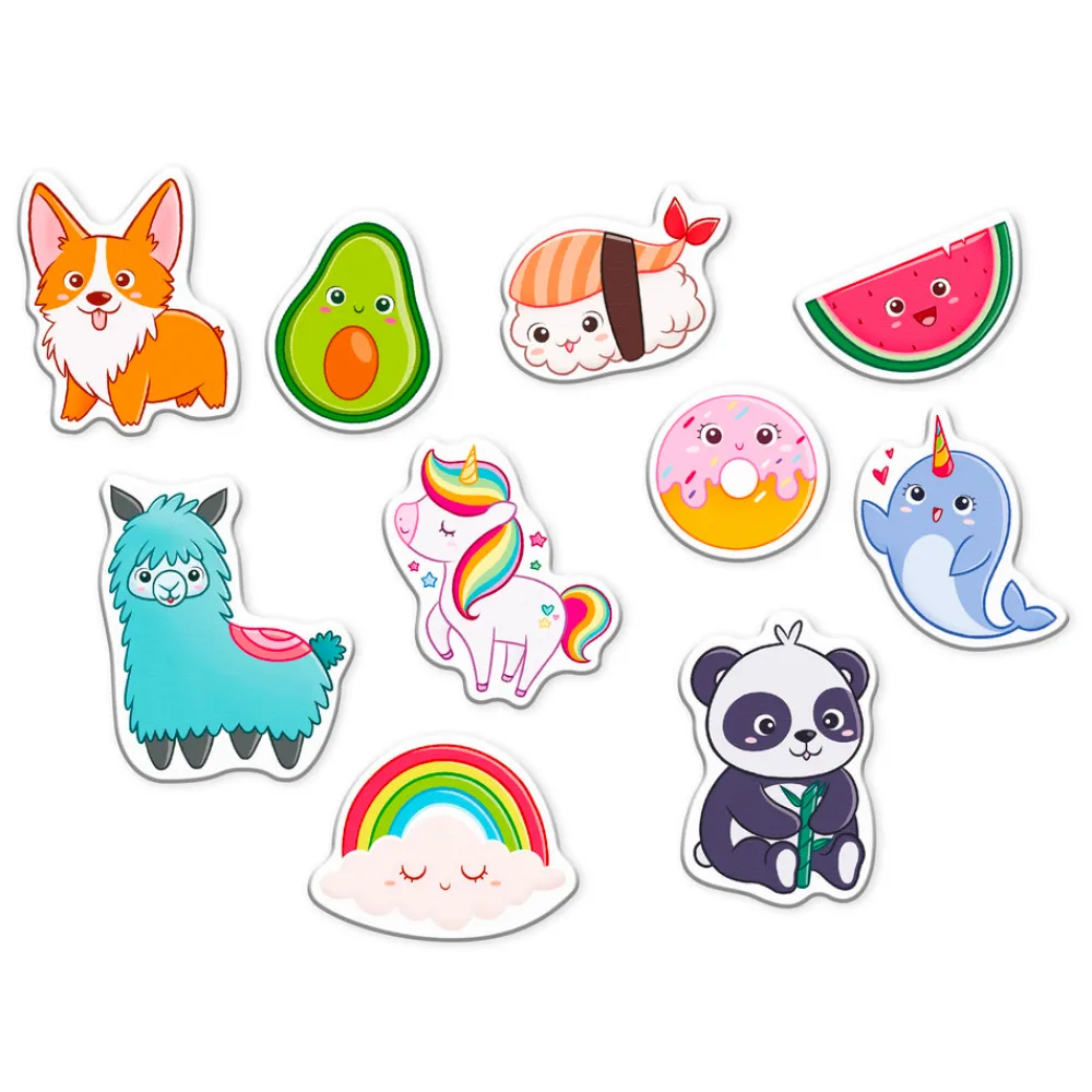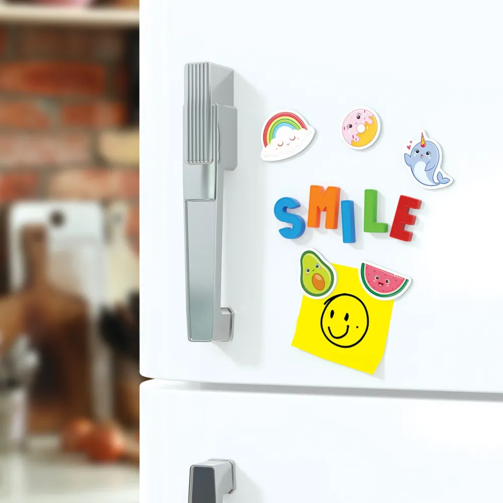 48 bogstaver, 48 magnetiske tal og 10 magneter til at sammensætte de første ord, lære at regne eller skrive farverige beskeder på køleskabsdøren eller på enhver metaloverflade.
